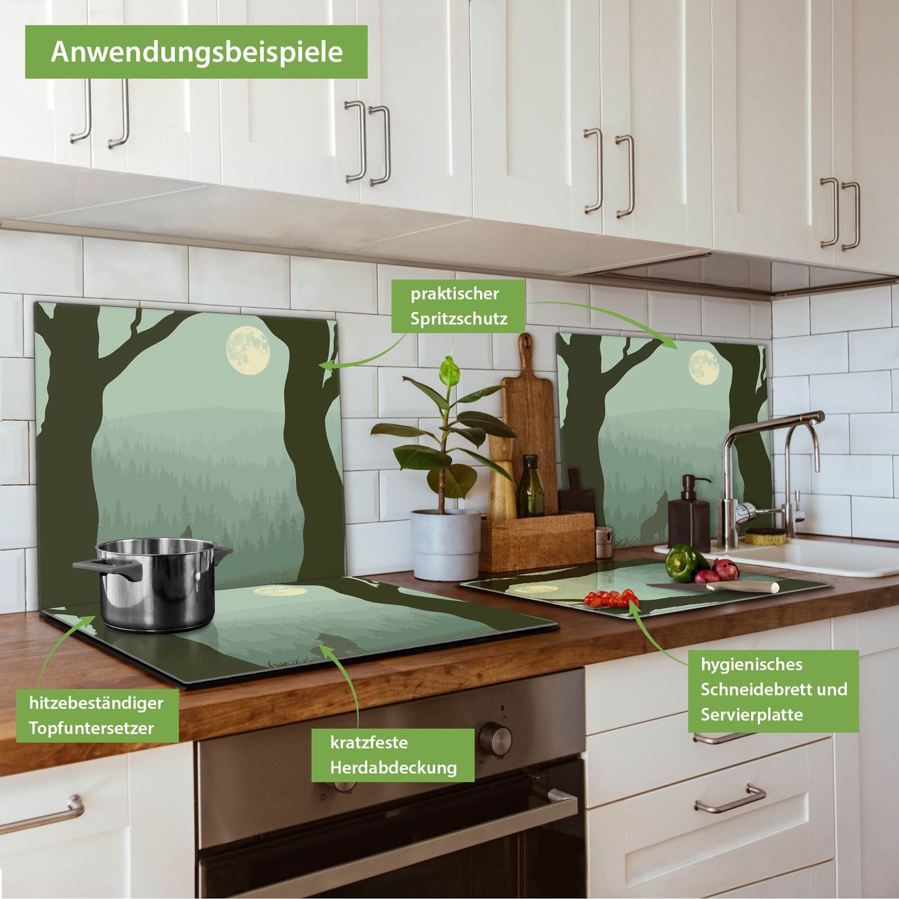 FUNKTION: Das banjado Schneidebrett mit Motiv Heulender Wolf ist groß und rutschfest und damit ideal für Ihre Küche. Besonders praktisch. Das Schneidebrett ist vielseitig einsetzbar: ob als Spritzschutz hinter dem Herd für Ihre Küche oder als Glas Schneidebrett als hygienische und geruchsneutrale Unterlage. Sie können ebenfalls heiße Töpfe und Pfannen bis 100°C auf der Herdplattenabdeckung abstellen. Sie erhalten ein Multitalent für Ihre Küche. QUALITÄT: Die Schneideplatte Glas besteht aus hochwertigem, gehärtetem und hitzebeständigem Glas. Wählen Sie aus einem unserer zahlreichen Motive das passende Design für Ihre Küche aus. DETAILS: Das Schneidebrett Glas groß ist in verschiedenen Größen verfügbar. Sie erhalten separate Gumminoppen damit Ihr großes Schneidebrett rutschfest in der Küche steht. VIELSEITIG: Das Schneidebrett modern ist ein Allrounder - als Schneideunterlage Küche direkt auf dem Herd oder separat und als Spritzschutz an der Wand aufgestellt - ein praktisches Küchenutensil. BANJADO: Auf Wunsch fertigen wir das Glas Schneide Brett auch als Sondergröße an. Mehrteilige Platten sind auch möglich. Kontaktieren Sie uns gern für eine Spezialanfertigung Ihrer Glasplatte Küche.