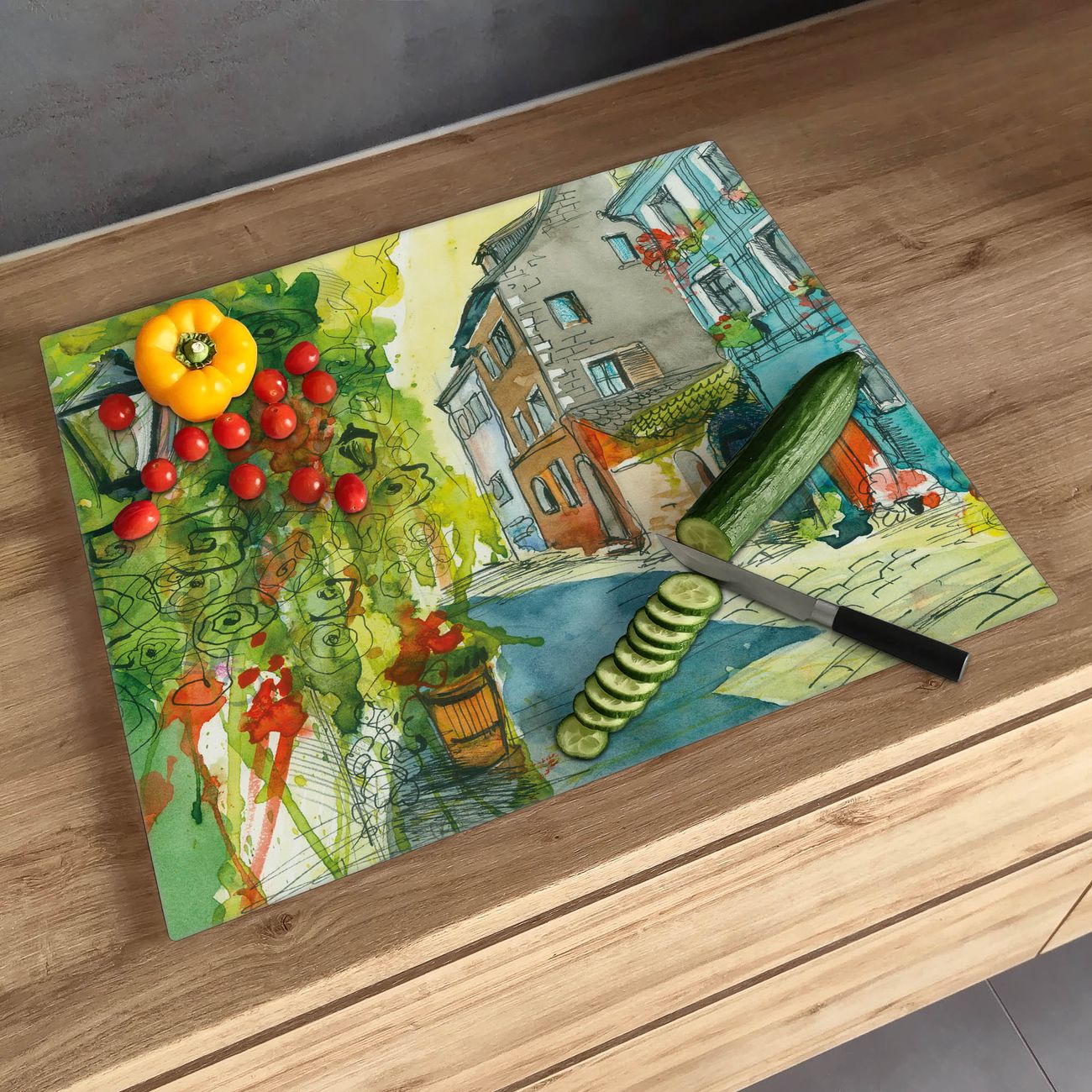 FUNKTION: Das banjado Schneidebrett mit Motiv Historischer Stadtkern ist groß und rutschfest und damit ideal für Ihre Küche. Besonders praktisch. Das Schneidebrett ist vielseitig einsetzbar: ob als Spritzschutz hinter dem Herd für Ihre Küche oder als Glas Schneidebrett als hygienische und geruchsneutrale Unterlage. Sie können ebenfalls heiße Töpfe und Pfannen bis 100°C auf der Herdplattenabdeckung abstellen. Sie erhalten ein Multitalent für Ihre Küche. QUALITÄT: Die Schneideplatte Glas besteht aus hochwertigem, gehärtetem und hitzebeständigem Glas. Wählen Sie aus einem unserer zahlreichen Motive das passende Design für Ihre Küche aus. DETAILS: Das Schneidebrett Glas groß ist in verschiedenen Größen verfügbar. Sie erhalten separate Gumminoppen damit Ihr großes Schneidebrett rutschfest in der Küche steht. VIELSEITIG: Das Schneidebrett modern ist ein Allrounder - als Schneideunterlage Küche direkt auf dem Herd oder separat und als Spritzschutz an der Wand aufgestellt - ein praktisches Küchenutensil. BANJADO: Auf Wunsch fertigen wir das Glas Schneide Brett auch als Sondergröße an. Mehrteilige Platten sind auch möglich. Kontaktieren Sie uns gern für eine Spezialanfertigung Ihrer Glasplatte Küche.