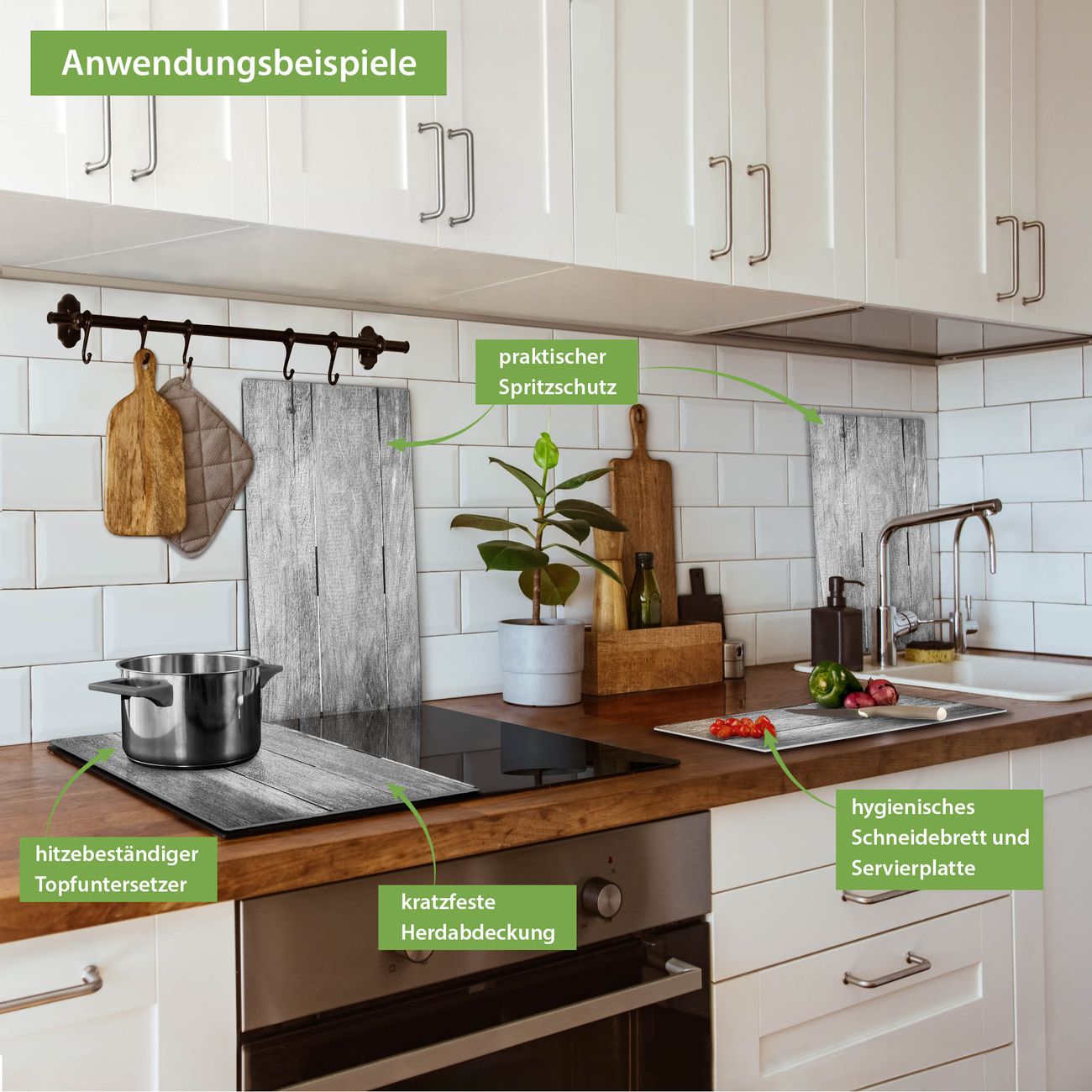 FUNKTION: Das banjado Schneidebrett mit Motiv Holz Monochrom ist groß und rutschfest und damit ideal für Ihre Küche. Besonders praktisch. Das Schneidebrett ist vielseitig einsetzbar: ob als Spritzschutz hinter dem Herd für Ihre Küche oder als Glas Schneidebrett als hygienische und geruchsneutrale Unterlage. Sie können ebenfalls heiße Töpfe und Pfannen bis 100°C auf der Herdplattenabdeckung abstellen. Sie erhalten ein Multitalent für Ihre Küche. QUALITÄT: Die Schneideplatte Glas besteht aus hochwertigem, gehärtetem und hitzebeständigem Glas. Wählen Sie aus einem unserer zahlreichen Motive das passende Design für Ihre Küche aus. DETAILS: Das Schneidebrett Glas groß ist in verschiedenen Größen verfügbar. Sie erhalten separate Gumminoppen damit Ihr großes Schneidebrett rutschfest in der Küche steht. VIELSEITIG: Das Schneidebrett modern ist ein Allrounder - als Schneideunterlage Küche direkt auf dem Herd oder separat und als Spritzschutz an der Wand aufgestellt - ein praktisches Küchenutensil. BANJADO: Auf Wunsch fertigen wir das Glas Schneide Brett auch als Sondergröße an. Mehrteilige Platten sind auch möglich. Kontaktieren Sie uns gern für eine Spezialanfertigung Ihrer Glasplatte Küche.