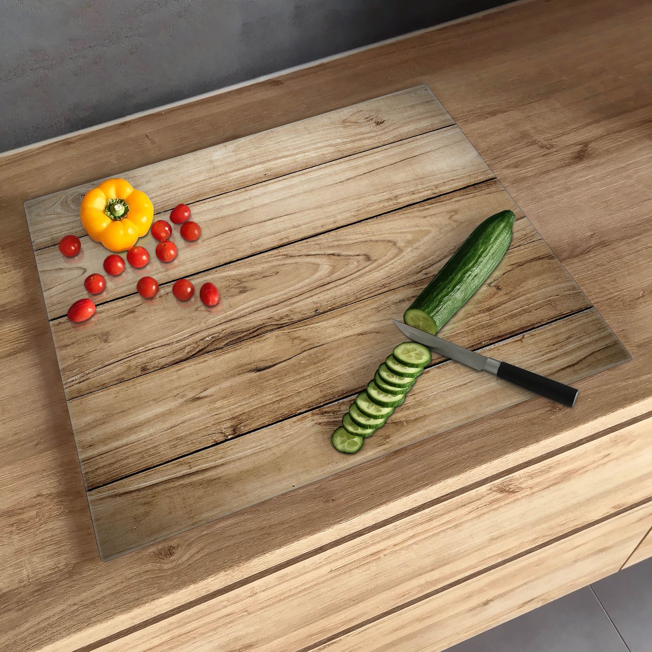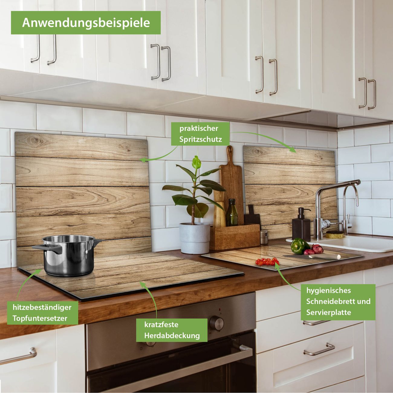 FUNKTION: Das banjado Schneidebrett mit Motiv Holzplanken ist groß und rutschfest und damit ideal für Ihre Küche. Besonders praktisch. Das Schneidebrett ist vielseitig einsetzbar: ob als Spritzschutz hinter dem Herd für Ihre Küche oder als Glas Schneidebrett als hygienische und geruchsneutrale Unterlage. Sie können ebenfalls heiße Töpfe und Pfannen bis 100°C auf der Herdplattenabdeckung abstellen. Sie erhalten ein Multitalent für Ihre Küche. QUALITÄT: Die Schneideplatte Glas besteht aus hochwertigem, gehärtetem und hitzebeständigem Glas. Wählen Sie aus einem unserer zahlreichen Motive das passende Design für Ihre Küche aus. DETAILS: Das Schneidebrett Glas groß ist in verschiedenen Größen verfügbar. Sie erhalten separate Gumminoppen damit Ihr großes Schneidebrett rutschfest in der Küche steht. VIELSEITIG: Das Schneidebrett modern ist ein Allrounder - als Schneideunterlage Küche direkt auf dem Herd oder separat und als Spritzschutz an der Wand aufgestellt - ein praktisches Küchenutensil. BANJADO: Auf Wunsch fertigen wir das Glas Schneide Brett auch als Sondergröße an. Mehrteilige Platten sind auch möglich. Kontaktieren Sie uns gern für eine Spezialanfertigung Ihrer Glasplatte Küche.