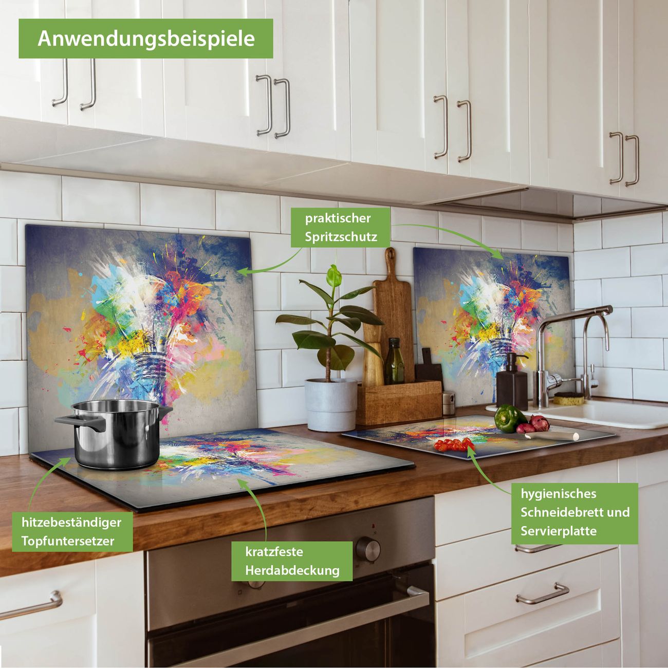 FUNKTION: Das banjado Schneidebrett mit Motiv Idee ist groß und rutschfest und damit ideal für Ihre Küche. Besonders praktisch. Das Schneidebrett ist vielseitig einsetzbar: ob als Spritzschutz hinter dem Herd für Ihre Küche oder als Glas Schneidebrett als hygienische und geruchsneutrale Unterlage. Sie können ebenfalls heiße Töpfe und Pfannen bis 100°C auf der Herdplattenabdeckung abstellen. Sie erhalten ein Multitalent für Ihre Küche. QUALITÄT: Die Schneideplatte Glas besteht aus hochwertigem, gehärtetem und hitzebeständigem Glas. Wählen Sie aus einem unserer zahlreichen Motive das passende Design für Ihre Küche aus. DETAILS: Das Schneidebrett Glas groß ist in verschiedenen Größen verfügbar. Sie erhalten separate Gumminoppen damit Ihr großes Schneidebrett rutschfest in der Küche steht. VIELSEITIG: Das Schneidebrett modern ist ein Allrounder - als Schneideunterlage Küche direkt auf dem Herd oder separat und als Spritzschutz an der Wand aufgestellt - ein praktisches Küchenutensil. BANJADO: Auf Wunsch fertigen wir das Glas Schneide Brett auch als Sondergröße an. Mehrteilige Platten sind auch möglich. Kontaktieren Sie uns gern für eine Spezialanfertigung Ihrer Glasplatte Küche.