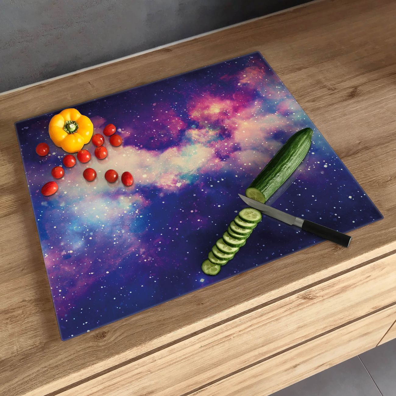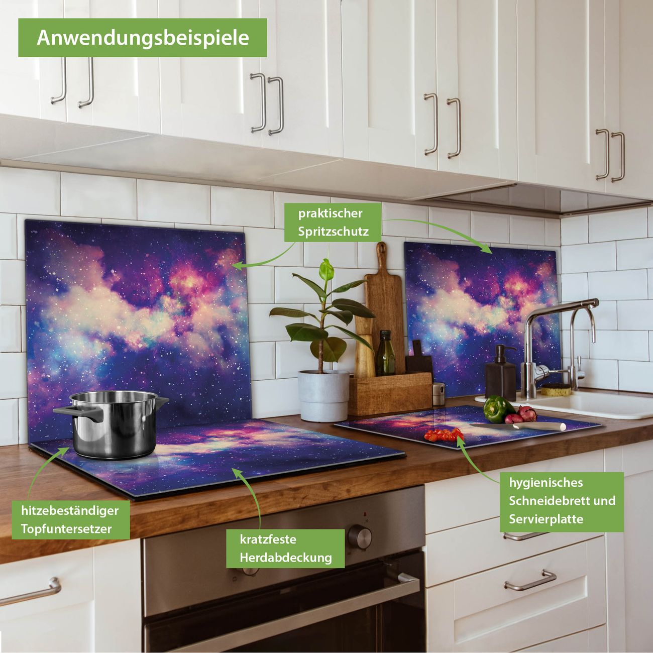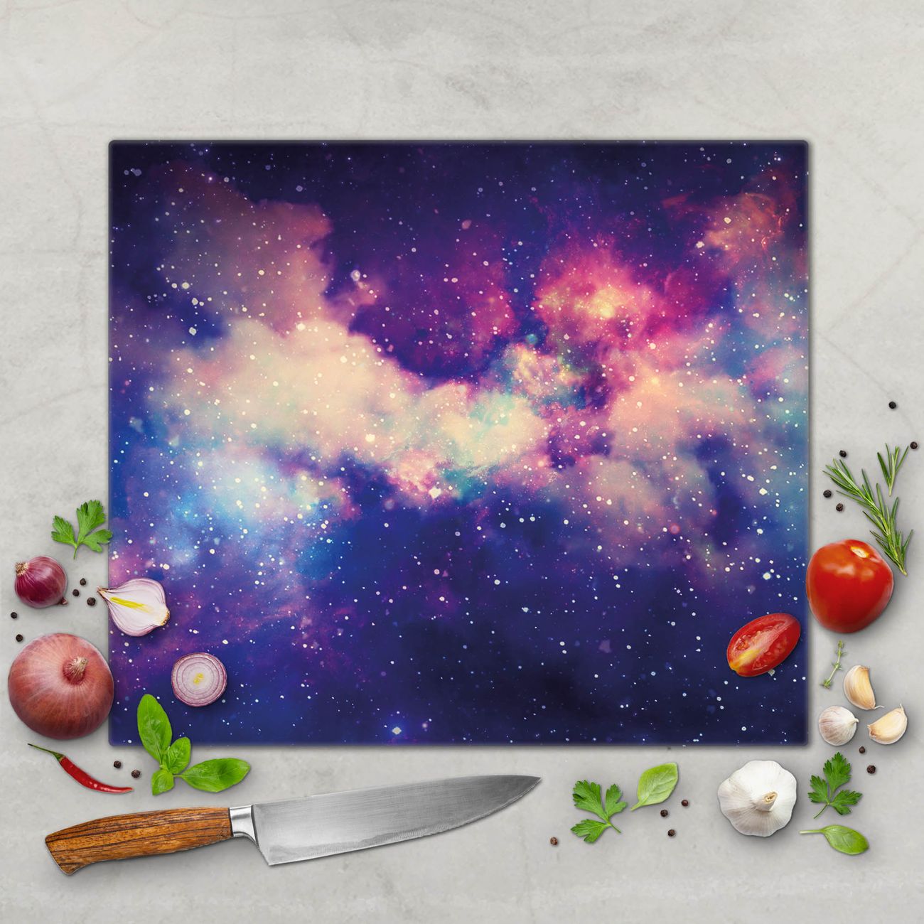 FUNKTION: Das banjado Schneidebrett mit Motiv Im Weltall 1 ist groß und rutschfest und damit ideal für Ihre Küche. Besonders praktisch. Das Schneidebrett ist vielseitig einsetzbar: ob als Spritzschutz hinter dem Herd für Ihre Küche oder als Glas Schneidebrett als hygienische und geruchsneutrale Unterlage. Sie können ebenfalls heiße Töpfe und Pfannen bis 100°C auf der Herdplattenabdeckung abstellen. Sie erhalten ein Multitalent für Ihre Küche. QUALITÄT: Die Schneideplatte Glas besteht aus hochwertigem, gehärtetem und hitzebeständigem Glas. Wählen Sie aus einem unserer zahlreichen Motive das passende Design für Ihre Küche aus. DETAILS: Das Schneidebrett Glas groß ist in verschiedenen Größen verfügbar. Sie erhalten separate Gumminoppen damit Ihr großes Schneidebrett rutschfest in der Küche steht. VIELSEITIG: Das Schneidebrett modern ist ein Allrounder - als Schneideunterlage Küche direkt auf dem Herd oder separat und als Spritzschutz an der Wand aufgestellt - ein praktisches Küchenutensil. BANJADO: Auf Wunsch fertigen wir das Glas Schneide Brett auch als Sondergröße an. Mehrteilige Platten sind auch möglich. Kontaktieren Sie uns gern für eine Spezialanfertigung Ihrer Glasplatte Küche.