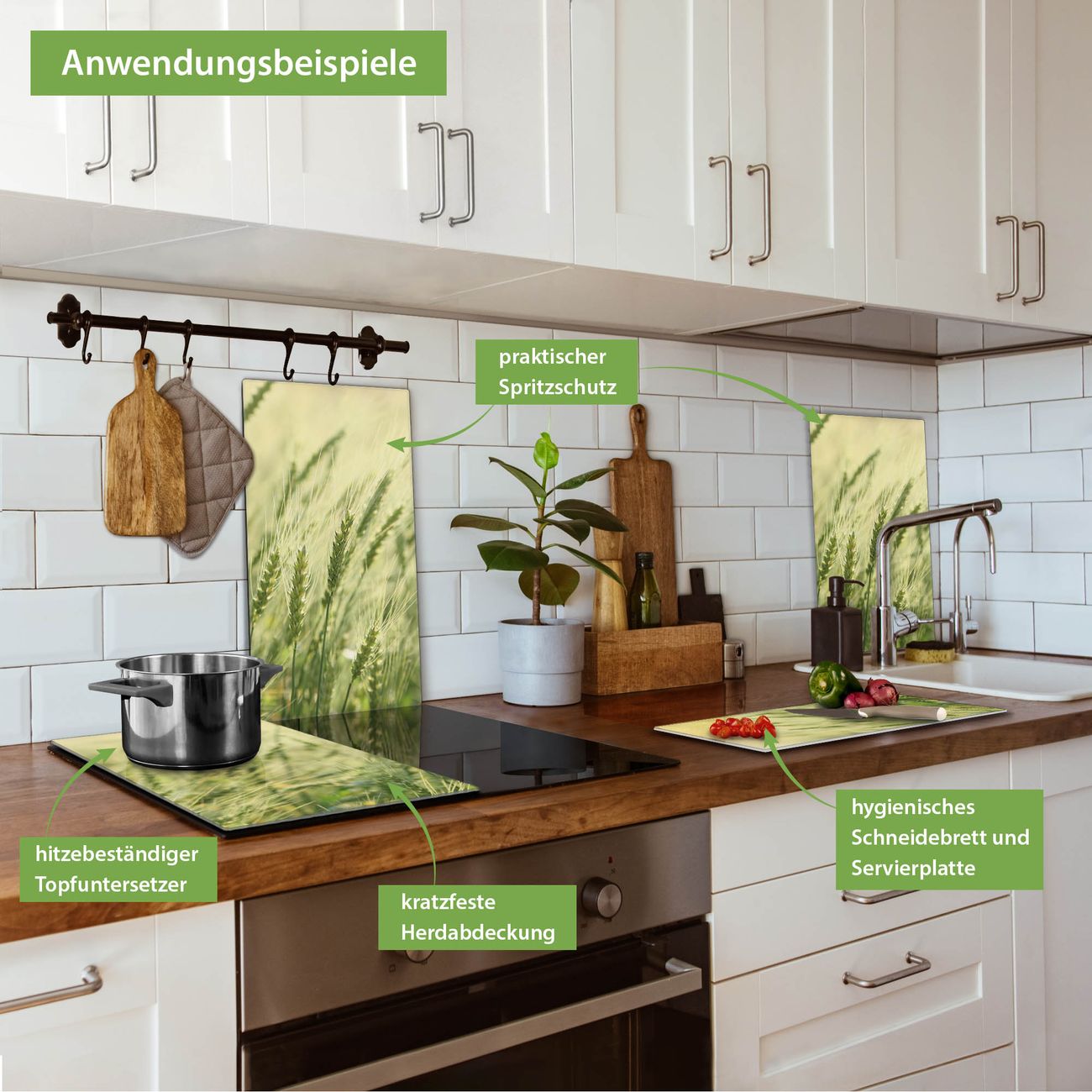 FUNKTION: Das banjado Schneidebrett mit Motiv Junges Getreide ist groß und rutschfest und damit ideal für Ihre Küche. Besonders praktisch. Das Schneidebrett ist vielseitig einsetzbar: ob als Spritzschutz hinter dem Herd für Ihre Küche oder als Glas Schneidebrett als hygienische und geruchsneutrale Unterlage. Sie können ebenfalls heiße Töpfe und Pfannen bis 100°C auf der Herdplattenabdeckung abstellen. Sie erhalten ein Multitalent für Ihre Küche. QUALITÄT: Die Schneideplatte Glas besteht aus hochwertigem, gehärtetem und hitzebeständigem Glas. Wählen Sie aus einem unserer zahlreichen Motive das passende Design für Ihre Küche aus. DETAILS: Das Schneidebrett Glas groß ist in verschiedenen Größen verfügbar. Sie erhalten separate Gumminoppen damit Ihr großes Schneidebrett rutschfest in der Küche steht. VIELSEITIG: Das Schneidebrett modern ist ein Allrounder - als Schneideunterlage Küche direkt auf dem Herd oder separat und als Spritzschutz an der Wand aufgestellt - ein praktisches Küchenutensil. BANJADO: Auf Wunsch fertigen wir das Glas Schneide Brett auch als Sondergröße an. Mehrteilige Platten sind auch möglich. Kontaktieren Sie uns gern für eine Spezialanfertigung Ihrer Glasplatte Küche.