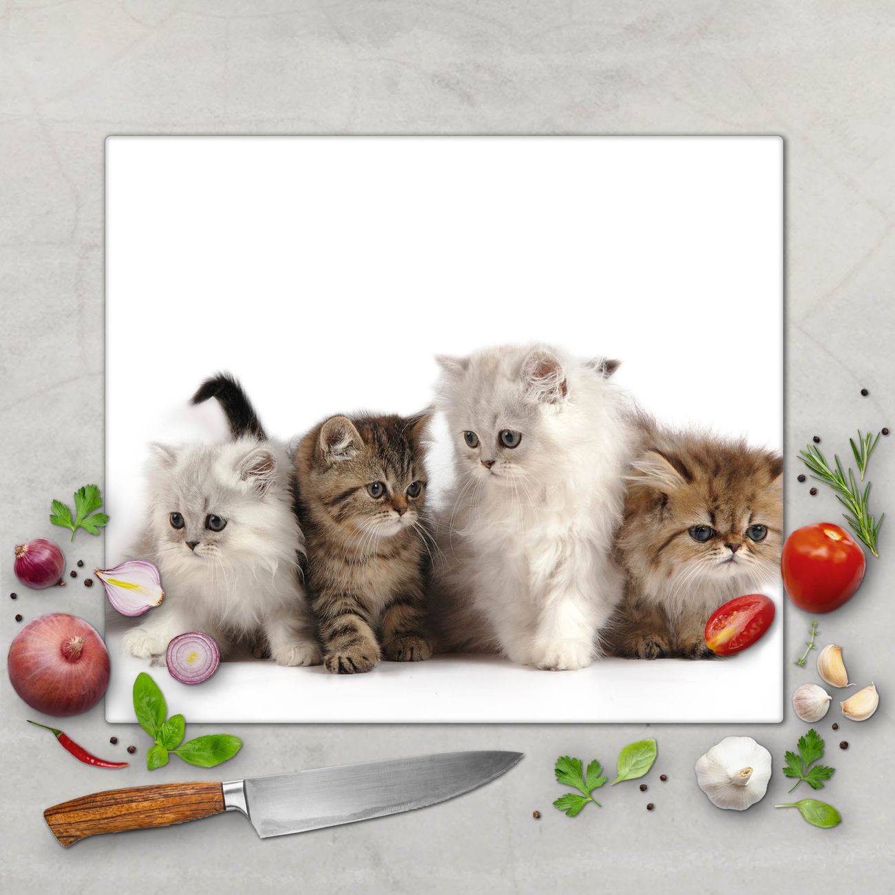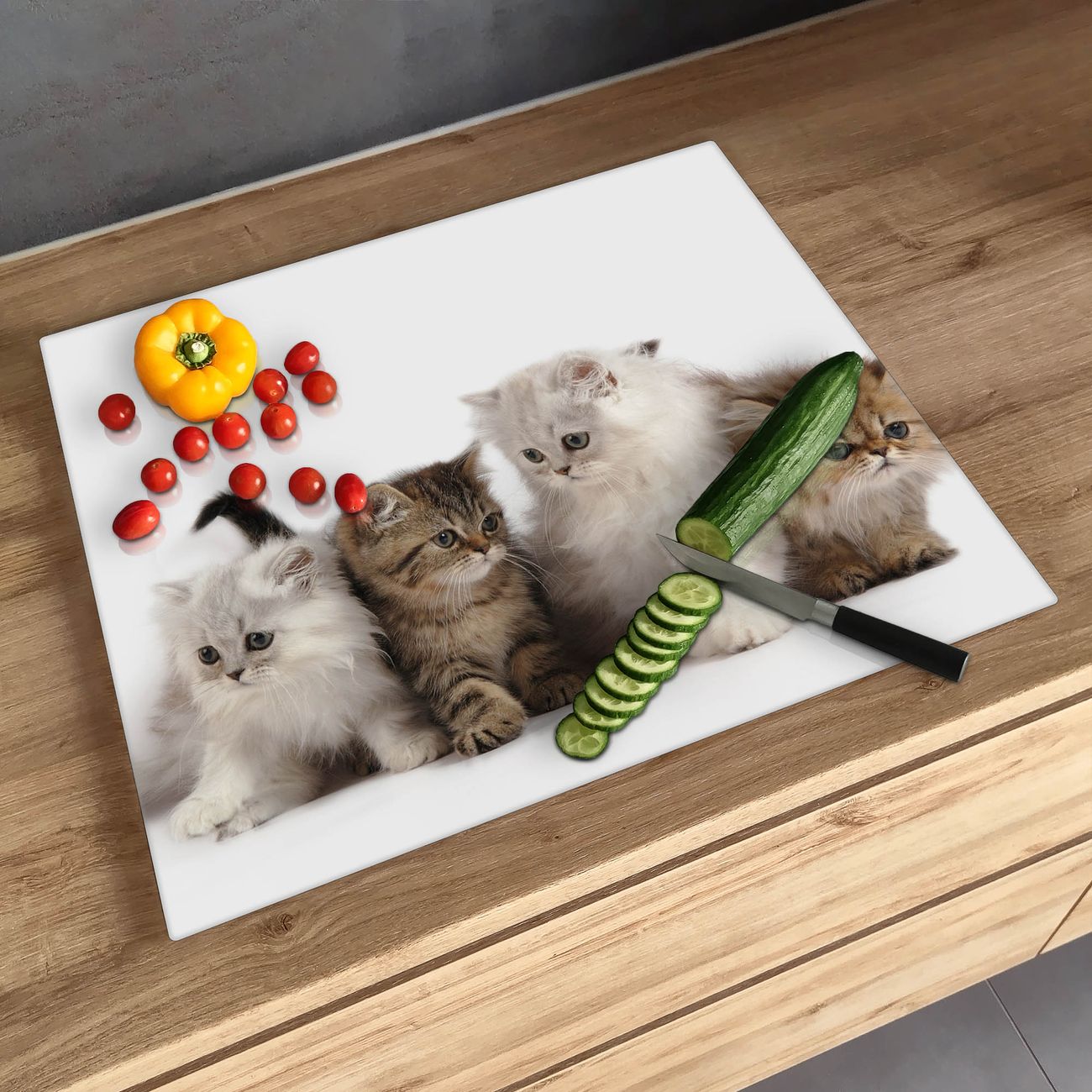 FUNKTION: Das banjado Schneidebrett mit Motiv Kaetzchen ist groß und rutschfest und damit ideal für Ihre Küche. Besonders praktisch. Das Schneidebrett ist vielseitig einsetzbar: ob als Spritzschutz hinter dem Herd für Ihre Küche oder als Glas Schneidebrett als hygienische und geruchsneutrale Unterlage. Sie können ebenfalls heiße Töpfe und Pfannen bis 100°C auf der Herdplattenabdeckung abstellen. Sie erhalten ein Multitalent für Ihre Küche. QUALITÄT: Die Schneideplatte Glas besteht aus hochwertigem, gehärtetem und hitzebeständigem Glas. Wählen Sie aus einem unserer zahlreichen Motive das passende Design für Ihre Küche aus. DETAILS: Das Schneidebrett Glas groß ist in verschiedenen Größen verfügbar. Sie erhalten separate Gumminoppen damit Ihr großes Schneidebrett rutschfest in der Küche steht. VIELSEITIG: Das Schneidebrett modern ist ein Allrounder - als Schneideunterlage Küche direkt auf dem Herd oder separat und als Spritzschutz an der Wand aufgestellt - ein praktisches Küchenutensil. BANJADO: Auf Wunsch fertigen wir das Glas Schneide Brett auch als Sondergröße an. Mehrteilige Platten sind auch möglich. Kontaktieren Sie uns gern für eine Spezialanfertigung Ihrer Glasplatte Küche.