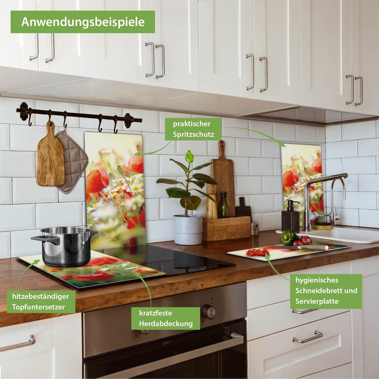 FUNKTION: Das banjado Schneidebrett mit Motiv Kamille Und Mohn ist groß und rutschfest und damit ideal für Ihre Küche. Besonders praktisch. Das Schneidebrett ist vielseitig einsetzbar: ob als Spritzschutz hinter dem Herd für Ihre Küche oder als Glas Schneidebrett als hygienische und geruchsneutrale Unterlage. Sie können ebenfalls heiße Töpfe und Pfannen bis 100°C auf der Herdplattenabdeckung abstellen. Sie erhalten ein Multitalent für Ihre Küche. QUALITÄT: Die Schneideplatte Glas besteht aus hochwertigem, gehärtetem und hitzebeständigem Glas. Wählen Sie aus einem unserer zahlreichen Motive das passende Design für Ihre Küche aus. DETAILS: Das Schneidebrett Glas groß ist in verschiedenen Größen verfügbar. Sie erhalten separate Gumminoppen damit Ihr großes Schneidebrett rutschfest in der Küche steht. VIELSEITIG: Das Schneidebrett modern ist ein Allrounder - als Schneideunterlage Küche direkt auf dem Herd oder separat und als Spritzschutz an der Wand aufgestellt - ein praktisches Küchenutensil. BANJADO: Auf Wunsch fertigen wir das Glas Schneide Brett auch als Sondergröße an. Mehrteilige Platten sind auch möglich. Kontaktieren Sie uns gern für eine Spezialanfertigung Ihrer Glasplatte Küche.