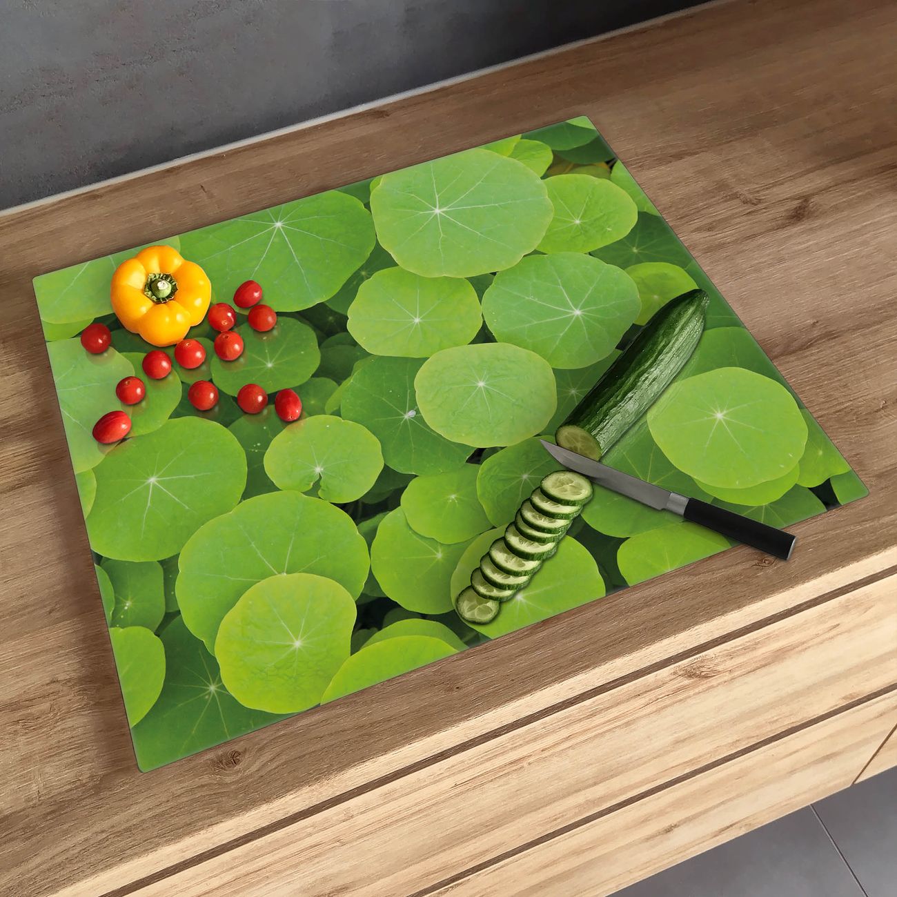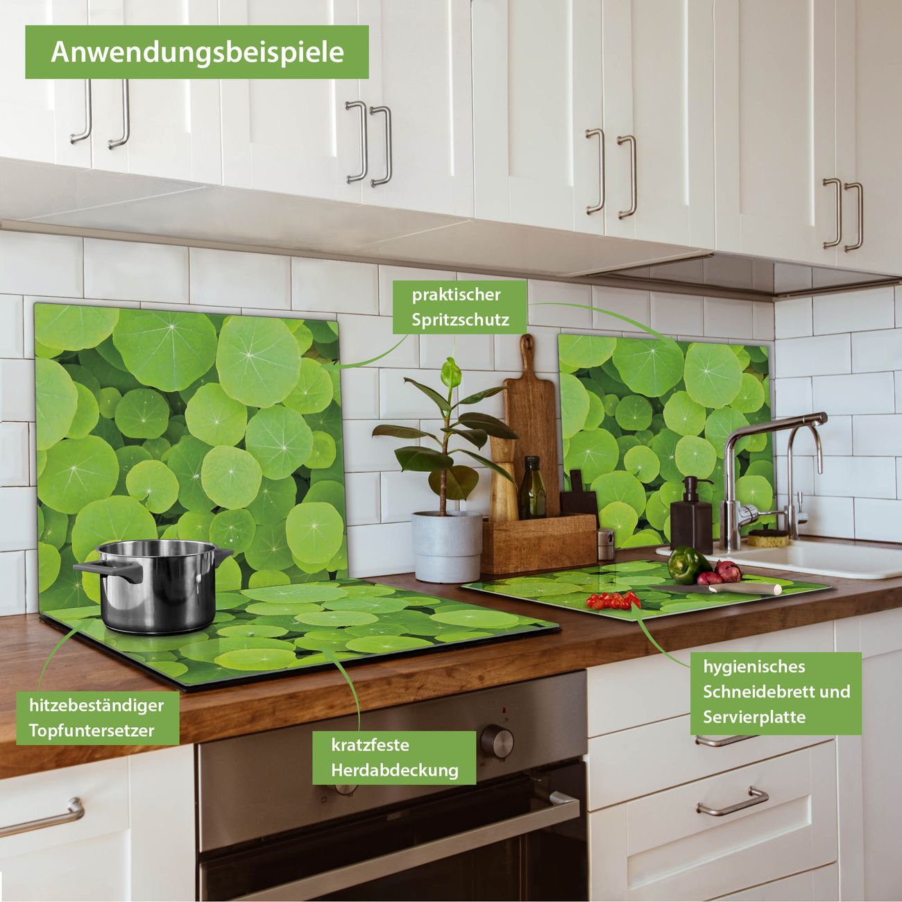 FUNKTION: Das banjado Schneidebrett mit Motiv Kapuzinerkresse ist groß und rutschfest und damit ideal für Ihre Küche. Besonders praktisch. Das Schneidebrett ist vielseitig einsetzbar: ob als Spritzschutz hinter dem Herd für Ihre Küche oder als Glas Schneidebrett als hygienische und geruchsneutrale Unterlage. Sie können ebenfalls heiße Töpfe und Pfannen bis 100°C auf der Herdplattenabdeckung abstellen. Sie erhalten ein Multitalent für Ihre Küche. QUALITÄT: Die Schneideplatte Glas besteht aus hochwertigem, gehärtetem und hitzebeständigem Glas. Wählen Sie aus einem unserer zahlreichen Motive das passende Design für Ihre Küche aus. DETAILS: Das Schneidebrett Glas groß ist in verschiedenen Größen verfügbar. Sie erhalten separate Gumminoppen damit Ihr großes Schneidebrett rutschfest in der Küche steht. VIELSEITIG: Das Schneidebrett modern ist ein Allrounder - als Schneideunterlage Küche direkt auf dem Herd oder separat und als Spritzschutz an der Wand aufgestellt - ein praktisches Küchenutensil. BANJADO: Auf Wunsch fertigen wir das Glas Schneide Brett auch als Sondergröße an. Mehrteilige Platten sind auch möglich. Kontaktieren Sie uns gern für eine Spezialanfertigung Ihrer Glasplatte Küche.