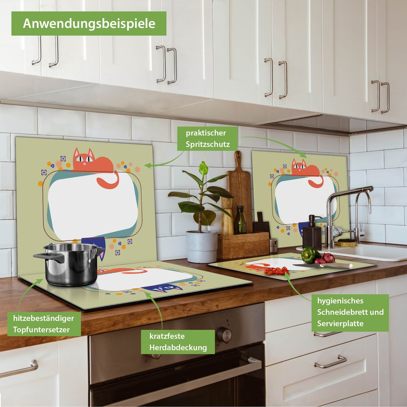 FUNKTION: Das banjado Schneidebrett mit Motiv Karikatur Katzen ist groß und rutschfest und damit ideal für Ihre Küche. Besonders praktisch. Das Schneidebrett ist vielseitig einsetzbar: ob als Spritzschutz hinter dem Herd für Ihre Küche oder als Glas Schneidebrett als hygienische und geruchsneutrale Unterlage. Sie können ebenfalls heiße Töpfe und Pfannen bis 100°C auf der Herdplattenabdeckung abstellen. Sie erhalten ein Multitalent für Ihre Küche. QUALITÄT: Die Schneideplatte Glas besteht aus hochwertigem, gehärtetem und hitzebeständigem Glas. Wählen Sie aus einem unserer zahlreichen Motive das passende Design für Ihre Küche aus. DETAILS: Das Schneidebrett Glas groß ist in verschiedenen Größen verfügbar. Sie erhalten separate Gumminoppen damit Ihr großes Schneidebrett rutschfest in der Küche steht. VIELSEITIG: Das Schneidebrett modern ist ein Allrounder - als Schneideunterlage Küche direkt auf dem Herd oder separat und als Spritzschutz an der Wand aufgestellt - ein praktisches Küchenutensil. BANJADO: Auf Wunsch fertigen wir das Glas Schneide Brett auch als Sondergröße an. Mehrteilige Platten sind auch möglich. Kontaktieren Sie uns gern für eine Spezialanfertigung Ihrer Glasplatte Küche.