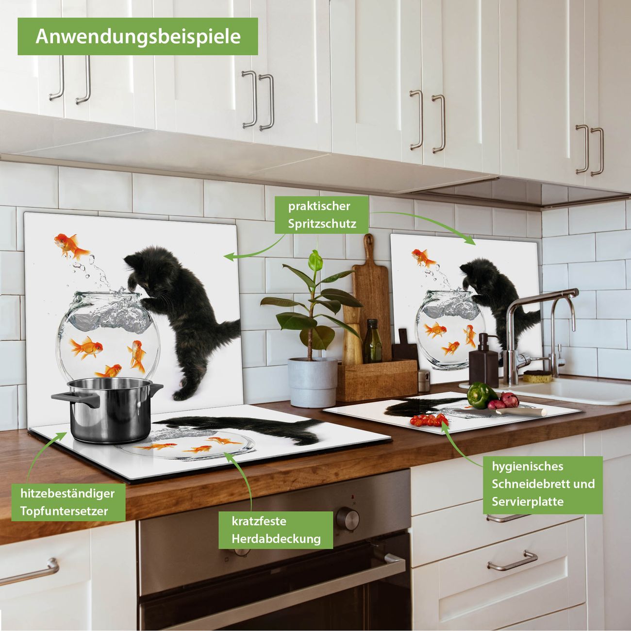 FUNKTION: Das banjado Schneidebrett mit Motiv Katze Und Fisch ist groß und rutschfest und damit ideal für Ihre Küche. Besonders praktisch. Das Schneidebrett ist vielseitig einsetzbar: ob als Spritzschutz hinter dem Herd für Ihre Küche oder als Glas Schneidebrett als hygienische und geruchsneutrale Unterlage. Sie können ebenfalls heiße Töpfe und Pfannen bis 100°C auf der Herdplattenabdeckung abstellen. Sie erhalten ein Multitalent für Ihre Küche. QUALITÄT: Die Schneideplatte Glas besteht aus hochwertigem, gehärtetem und hitzebeständigem Glas. Wählen Sie aus einem unserer zahlreichen Motive das passende Design für Ihre Küche aus. DETAILS: Das Schneidebrett Glas groß ist in verschiedenen Größen verfügbar. Sie erhalten separate Gumminoppen damit Ihr großes Schneidebrett rutschfest in der Küche steht. VIELSEITIG: Das Schneidebrett modern ist ein Allrounder - als Schneideunterlage Küche direkt auf dem Herd oder separat und als Spritzschutz an der Wand aufgestellt - ein praktisches Küchenutensil. BANJADO: Auf Wunsch fertigen wir das Glas Schneide Brett auch als Sondergröße an. Mehrteilige Platten sind auch möglich. Kontaktieren Sie uns gern für eine Spezialanfertigung Ihrer Glasplatte Küche.
