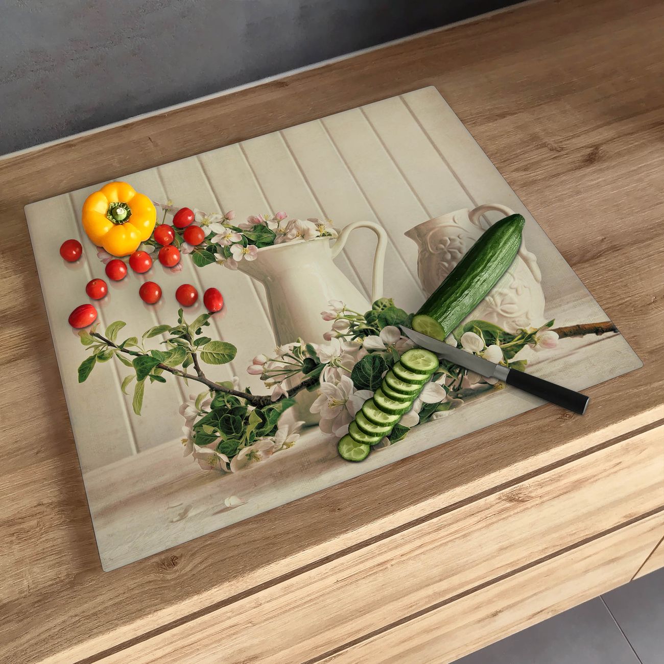 FUNKTION: Das banjado Schneidebrett mit Motiv Kirschzweige ist groß und rutschfest und damit ideal für Ihre Küche. Besonders praktisch. Das Schneidebrett ist vielseitig einsetzbar: ob als Spritzschutz hinter dem Herd für Ihre Küche oder als Glas Schneidebrett als hygienische und geruchsneutrale Unterlage. Sie können ebenfalls heiße Töpfe und Pfannen bis 100°C auf der Herdplattenabdeckung abstellen. Sie erhalten ein Multitalent für Ihre Küche. QUALITÄT: Die Schneideplatte Glas besteht aus hochwertigem, gehärtetem und hitzebeständigem Glas. Wählen Sie aus einem unserer zahlreichen Motive das passende Design für Ihre Küche aus. DETAILS: Das Schneidebrett Glas groß ist in verschiedenen Größen verfügbar. Sie erhalten separate Gumminoppen damit Ihr großes Schneidebrett rutschfest in der Küche steht. VIELSEITIG: Das Schneidebrett modern ist ein Allrounder - als Schneideunterlage Küche direkt auf dem Herd oder separat und als Spritzschutz an der Wand aufgestellt - ein praktisches Küchenutensil. BANJADO: Auf Wunsch fertigen wir das Glas Schneide Brett auch als Sondergröße an. Mehrteilige Platten sind auch möglich. Kontaktieren Sie uns gern für eine Spezialanfertigung Ihrer Glasplatte Küche.