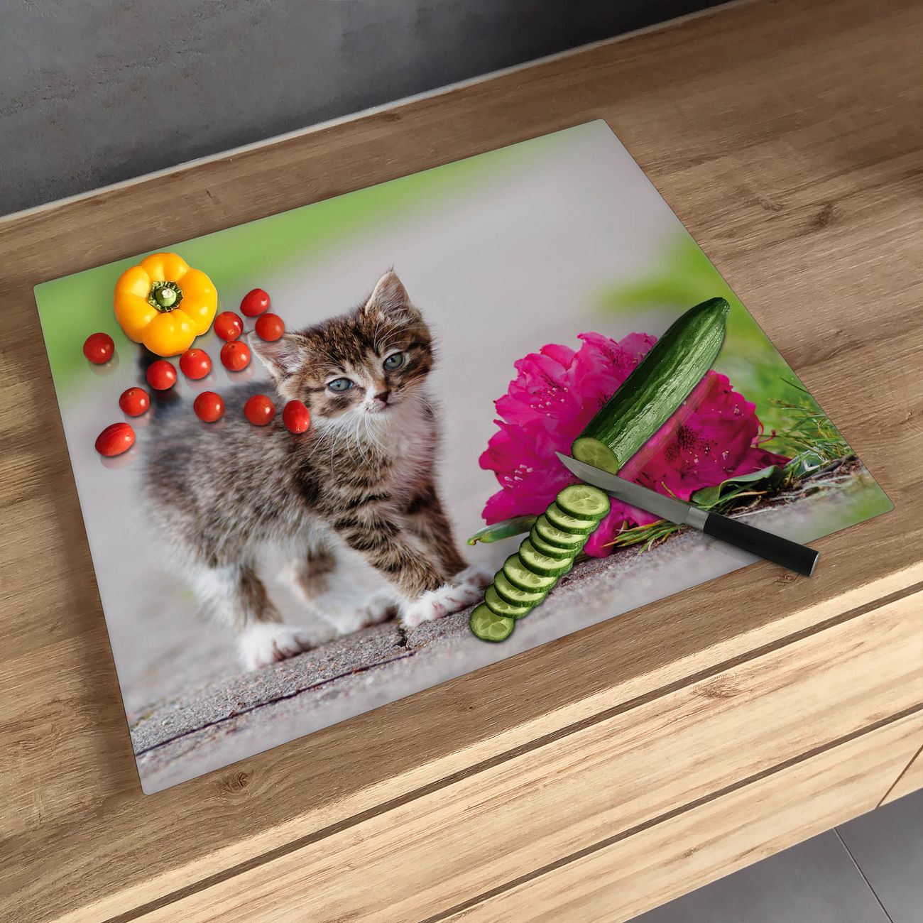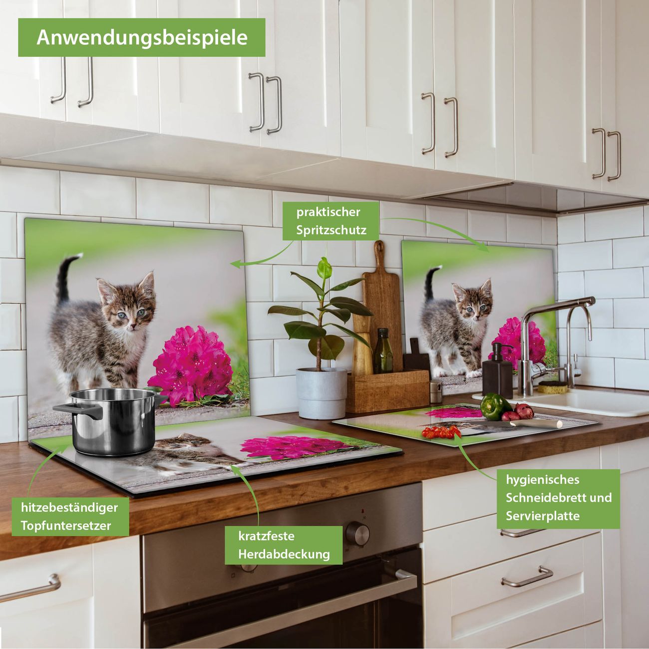 FUNKTION: Das banjado Schneidebrett mit Motiv Knut ist groß und rutschfest und damit ideal für Ihre Küche. Besonders praktisch. Das Schneidebrett ist vielseitig einsetzbar: ob als Spritzschutz hinter dem Herd für Ihre Küche oder als Glas Schneidebrett als hygienische und geruchsneutrale Unterlage. Sie können ebenfalls heiße Töpfe und Pfannen bis 100°C auf der Herdplattenabdeckung abstellen. Sie erhalten ein Multitalent für Ihre Küche. QUALITÄT: Die Schneideplatte Glas besteht aus hochwertigem, gehärtetem und hitzebeständigem Glas. Wählen Sie aus einem unserer zahlreichen Motive das passende Design für Ihre Küche aus. DETAILS: Das Schneidebrett Glas groß ist in verschiedenen Größen verfügbar. Sie erhalten separate Gumminoppen damit Ihr großes Schneidebrett rutschfest in der Küche steht. VIELSEITIG: Das Schneidebrett modern ist ein Allrounder - als Schneideunterlage Küche direkt auf dem Herd oder separat und als Spritzschutz an der Wand aufgestellt - ein praktisches Küchenutensil. BANJADO: Auf Wunsch fertigen wir das Glas Schneide Brett auch als Sondergröße an. Mehrteilige Platten sind auch möglich. Kontaktieren Sie uns gern für eine Spezialanfertigung Ihrer Glasplatte Küche.