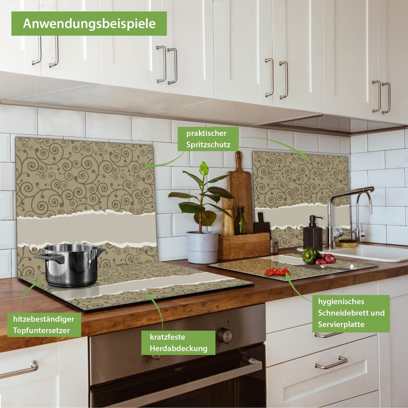 FUNKTION: Das banjado Schneidebrett mit Motiv Kringel ist groß und rutschfest und damit ideal für Ihre Küche. Besonders praktisch. Das Schneidebrett ist vielseitig einsetzbar: ob als Spritzschutz hinter dem Herd für Ihre Küche oder als Glas Schneidebrett als hygienische und geruchsneutrale Unterlage. Sie können ebenfalls heiße Töpfe und Pfannen bis 100°C auf der Herdplattenabdeckung abstellen. Sie erhalten ein Multitalent für Ihre Küche. QUALITÄT: Die Schneideplatte Glas besteht aus hochwertigem, gehärtetem und hitzebeständigem Glas. Wählen Sie aus einem unserer zahlreichen Motive das passende Design für Ihre Küche aus. DETAILS: Das Schneidebrett Glas groß ist in verschiedenen Größen verfügbar. Sie erhalten separate Gumminoppen damit Ihr großes Schneidebrett rutschfest in der Küche steht. VIELSEITIG: Das Schneidebrett modern ist ein Allrounder - als Schneideunterlage Küche direkt auf dem Herd oder separat und als Spritzschutz an der Wand aufgestellt - ein praktisches Küchenutensil. BANJADO: Auf Wunsch fertigen wir das Glas Schneide Brett auch als Sondergröße an. Mehrteilige Platten sind auch möglich. Kontaktieren Sie uns gern für eine Spezialanfertigung Ihrer Glasplatte Küche.