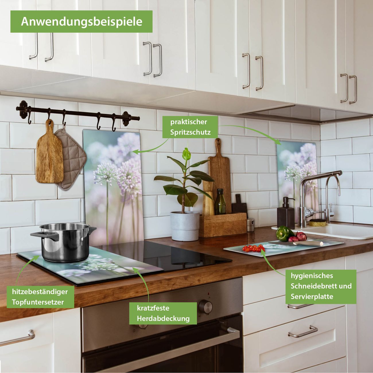 FUNKTION: Das banjado Schneidebrett mit Motiv Lauchblüte ist groß und rutschfest und damit ideal für Ihre Küche. Besonders praktisch. Das Schneidebrett ist vielseitig einsetzbar: ob als Spritzschutz hinter dem Herd für Ihre Küche oder als Glas Schneidebrett als hygienische und geruchsneutrale Unterlage. Sie können ebenfalls heiße Töpfe und Pfannen bis 100°C auf der Herdplattenabdeckung abstellen. Sie erhalten ein Multitalent für Ihre Küche. QUALITÄT: Die Schneideplatte Glas besteht aus hochwertigem, gehärtetem und hitzebeständigem Glas. Wählen Sie aus einem unserer zahlreichen Motive das passende Design für Ihre Küche aus. DETAILS: Das Schneidebrett Glas groß ist in verschiedenen Größen verfügbar. Sie erhalten separate Gumminoppen damit Ihr großes Schneidebrett rutschfest in der Küche steht. VIELSEITIG: Das Schneidebrett modern ist ein Allrounder - als Schneideunterlage Küche direkt auf dem Herd oder separat und als Spritzschutz an der Wand aufgestellt - ein praktisches Küchenutensil. BANJADO: Auf Wunsch fertigen wir das Glas Schneide Brett auch als Sondergröße an. Mehrteilige Platten sind auch möglich. Kontaktieren Sie uns gern für eine Spezialanfertigung Ihrer Glasplatte Küche.