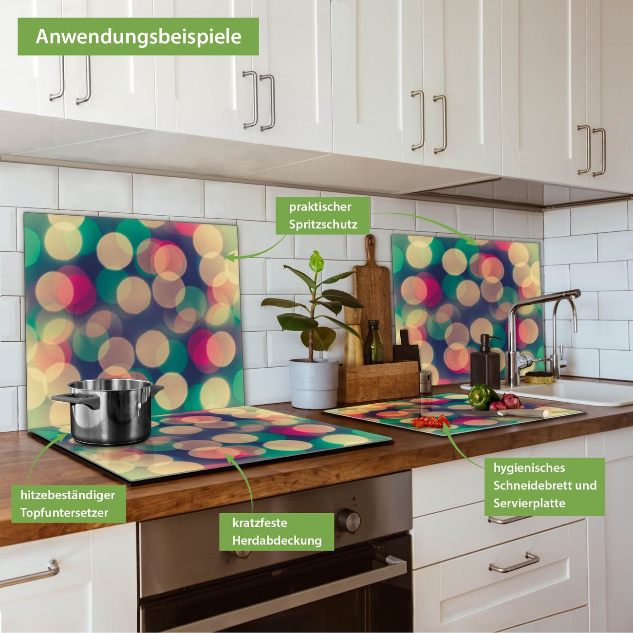 FUNKTION: Das banjado Schneidebrett mit Motiv Lichtpunkte Weiß Grün Rot ist groß und rutschfest und damit ideal für Ihre Küche. Besonders praktisch. Das Schneidebrett ist vielseitig einsetzbar: ob als Spritzschutz hinter dem Herd für Ihre Küche oder als Glas Schneidebrett als hygienische und geruchsneutrale Unterlage. Sie können ebenfalls heiße Töpfe und Pfannen bis 100°C auf der Herdplattenabdeckung abstellen. Sie erhalten ein Multitalent für Ihre Küche. QUALITÄT: Die Schneideplatte Glas besteht aus hochwertigem, gehärtetem und hitzebeständigem Glas. Wählen Sie aus einem unserer zahlreichen Motive das passende Design für Ihre Küche aus. DETAILS: Das Schneidebrett Glas groß ist in verschiedenen Größen verfügbar. Sie erhalten separate Gumminoppen damit Ihr großes Schneidebrett rutschfest in der Küche steht. VIELSEITIG: Das Schneidebrett modern ist ein Allrounder - als Schneideunterlage Küche direkt auf dem Herd oder separat und als Spritzschutz an der Wand aufgestellt - ein praktisches Küchenutensil. BANJADO: Auf Wunsch fertigen wir das Glas Schneide Brett auch als Sondergröße an. Mehrteilige Platten sind auch möglich. Kontaktieren Sie uns gern für eine Spezialanfertigung Ihrer Glasplatte Küche.