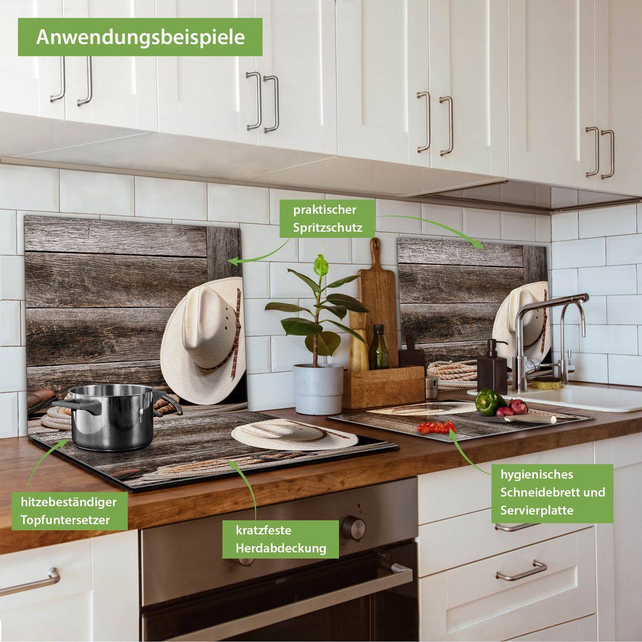 FUNKTION: Das banjado Schneidebrett mit Motiv Linedance Set ist groß und rutschfest und damit ideal für Ihre Küche. Besonders praktisch. Das Schneidebrett ist vielseitig einsetzbar: ob als Spritzschutz hinter dem Herd für Ihre Küche oder als Glas Schneidebrett als hygienische und geruchsneutrale Unterlage. Sie können ebenfalls heiße Töpfe und Pfannen bis 100°C auf der Herdplattenabdeckung abstellen. Sie erhalten ein Multitalent für Ihre Küche. QUALITÄT: Die Schneideplatte Glas besteht aus hochwertigem, gehärtetem und hitzebeständigem Glas. Wählen Sie aus einem unserer zahlreichen Motive das passende Design für Ihre Küche aus. DETAILS: Das Schneidebrett Glas groß ist in verschiedenen Größen verfügbar. Sie erhalten separate Gumminoppen damit Ihr großes Schneidebrett rutschfest in der Küche steht. VIELSEITIG: Das Schneidebrett modern ist ein Allrounder - als Schneideunterlage Küche direkt auf dem Herd oder separat und als Spritzschutz an der Wand aufgestellt - ein praktisches Küchenutensil. BANJADO: Auf Wunsch fertigen wir das Glas Schneide Brett auch als Sondergröße an. Mehrteilige Platten sind auch möglich. Kontaktieren Sie uns gern für eine Spezialanfertigung Ihrer Glasplatte Küche.