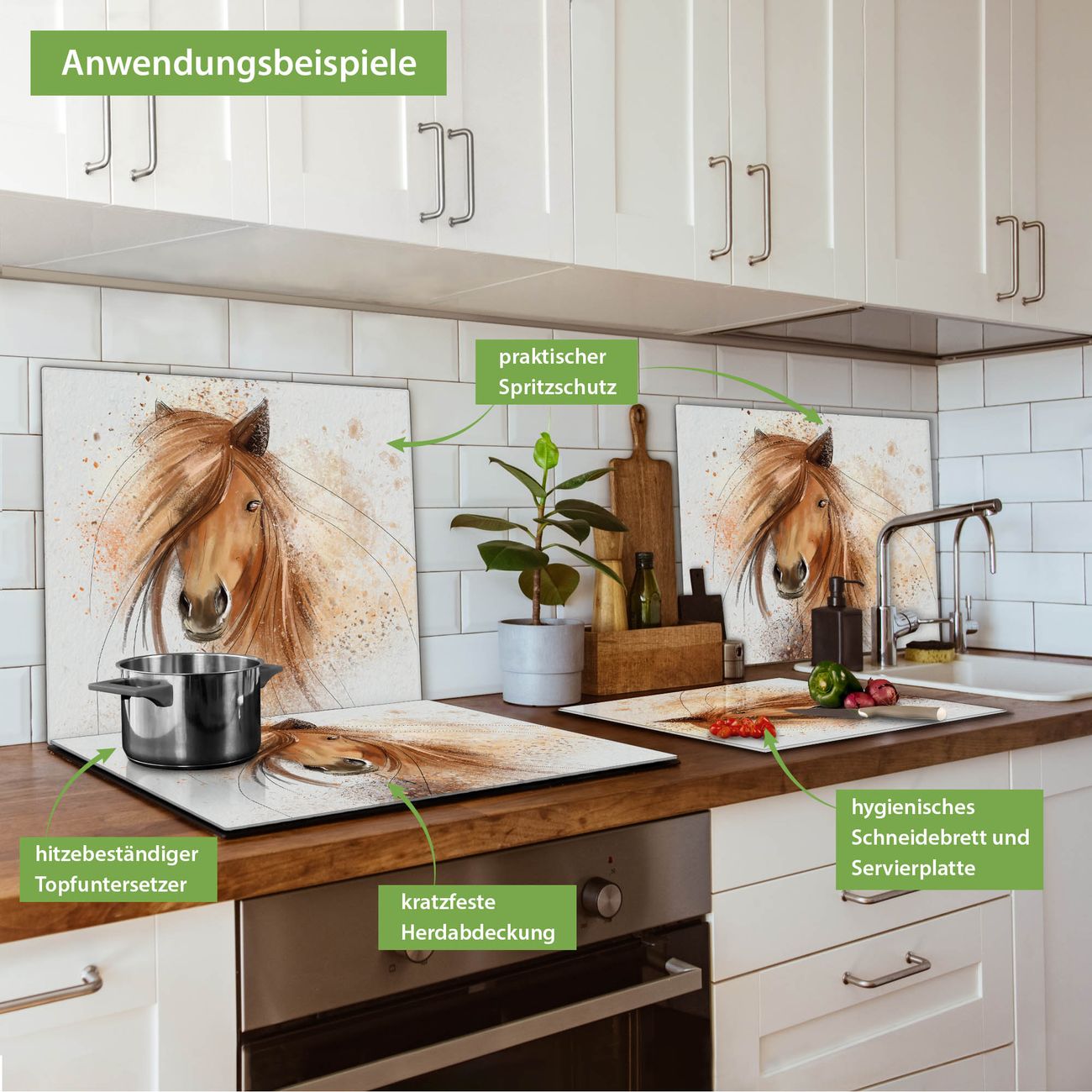 FUNKTION: Das banjado Schneidebrett mit Motiv Magic Horse ist groß und rutschfest und damit ideal für Ihre Küche. Besonders praktisch. Das Schneidebrett ist vielseitig einsetzbar: ob als Spritzschutz hinter dem Herd für Ihre Küche oder als Glas Schneidebrett als hygienische und geruchsneutrale Unterlage. Sie können ebenfalls heiße Töpfe und Pfannen bis 100°C auf der Herdplattenabdeckung abstellen. Sie erhalten ein Multitalent für Ihre Küche. QUALITÄT: Die Schneideplatte Glas besteht aus hochwertigem, gehärtetem und hitzebeständigem Glas. Wählen Sie aus einem unserer zahlreichen Motive das passende Design für Ihre Küche aus. DETAILS: Das Schneidebrett Glas groß ist in verschiedenen Größen verfügbar. Sie erhalten separate Gumminoppen damit Ihr großes Schneidebrett rutschfest in der Küche steht. VIELSEITIG: Das Schneidebrett modern ist ein Allrounder - als Schneideunterlage Küche direkt auf dem Herd oder separat und als Spritzschutz an der Wand aufgestellt - ein praktisches Küchenutensil. BANJADO: Auf Wunsch fertigen wir das Glas Schneide Brett auch als Sondergröße an. Mehrteilige Platten sind auch möglich. Kontaktieren Sie uns gern für eine Spezialanfertigung Ihrer Glasplatte Küche.