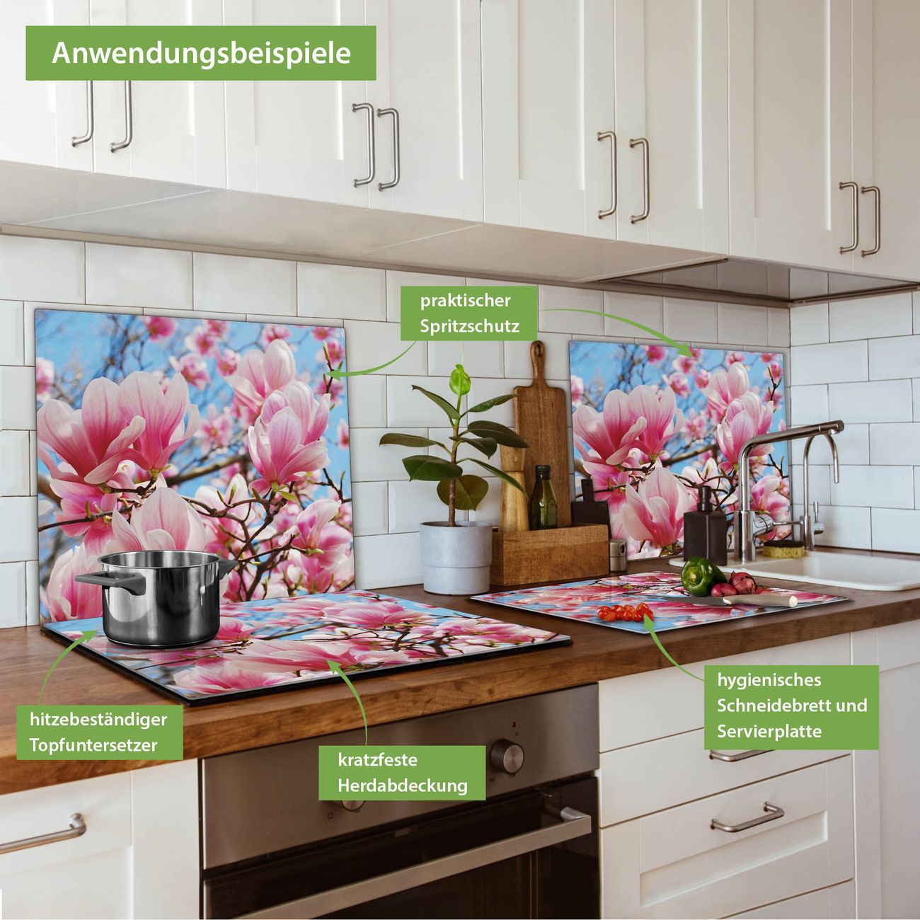 FUNKTION: Das banjado Schneidebrett mit Motiv Magnolienbaum ist groß und rutschfest und damit ideal für Ihre Küche. Besonders praktisch. Das Schneidebrett ist vielseitig einsetzbar: ob als Spritzschutz hinter dem Herd für Ihre Küche oder als Glas Schneidebrett als hygienische und geruchsneutrale Unterlage. Sie können ebenfalls heiße Töpfe und Pfannen bis 100°C auf der Herdplattenabdeckung abstellen. Sie erhalten ein Multitalent für Ihre Küche. QUALITÄT: Die Schneideplatte Glas besteht aus hochwertigem, gehärtetem und hitzebeständigem Glas. Wählen Sie aus einem unserer zahlreichen Motive das passende Design für Ihre Küche aus. DETAILS: Das Schneidebrett Glas groß ist in verschiedenen Größen verfügbar. Sie erhalten separate Gumminoppen damit Ihr großes Schneidebrett rutschfest in der Küche steht. VIELSEITIG: Das Schneidebrett modern ist ein Allrounder - als Schneideunterlage Küche direkt auf dem Herd oder separat und als Spritzschutz an der Wand aufgestellt - ein praktisches Küchenutensil. BANJADO: Auf Wunsch fertigen wir das Glas Schneide Brett auch als Sondergröße an. Mehrteilige Platten sind auch möglich. Kontaktieren Sie uns gern für eine Spezialanfertigung Ihrer Glasplatte Küche.