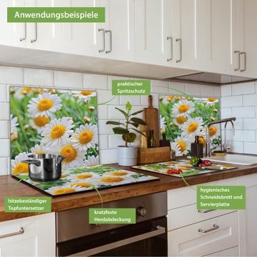 FUNKTION: Das banjado Schneidebrett mit Motiv Margeriten Illustration ist groß und rutschfest und damit ideal für Ihre Küche. Besonders praktisch. Das Schneidebrett ist vielseitig einsetzbar: ob als Spritzschutz hinter dem Herd für Ihre Küche oder als Glas Schneidebrett als hygienische und geruchsneutrale Unterlage. Sie können ebenfalls heiße Töpfe und Pfannen bis 100°C auf der Herdplattenabdeckung abstellen. Sie erhalten ein Multitalent für Ihre Küche. QUALITÄT: Die Schneideplatte Glas besteht aus hochwertigem, gehärtetem und hitzebeständigem Glas. Wählen Sie aus einem unserer zahlreichen Motive das passende Design für Ihre Küche aus. DETAILS: Das Schneidebrett Glas groß ist in verschiedenen Größen verfügbar. Sie erhalten separate Gumminoppen damit Ihr großes Schneidebrett rutschfest in der Küche steht. VIELSEITIG: Das Schneidebrett modern ist ein Allrounder - als Schneideunterlage Küche direkt auf dem Herd oder separat und als Spritzschutz an der Wand aufgestellt - ein praktisches Küchenutensil. BANJADO: Auf Wunsch fertigen wir das Glas Schneide Brett auch als Sondergröße an. Mehrteilige Platten sind auch möglich. Kontaktieren Sie uns gern für eine Spezialanfertigung Ihrer Glasplatte Küche.