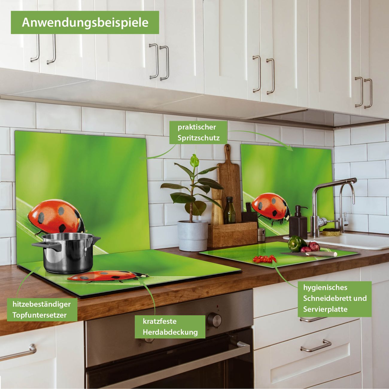 FUNKTION: Das banjado Schneidebrett mit Motiv Marienkäfer ist groß und rutschfest und damit ideal für Ihre Küche. Besonders praktisch. Das Schneidebrett ist vielseitig einsetzbar: ob als Spritzschutz hinter dem Herd für Ihre Küche oder als Glas Schneidebrett als hygienische und geruchsneutrale Unterlage. Sie können ebenfalls heiße Töpfe und Pfannen bis 100°C auf der Herdplattenabdeckung abstellen. Sie erhalten ein Multitalent für Ihre Küche. QUALITÄT: Die Schneideplatte Glas besteht aus hochwertigem, gehärtetem und hitzebeständigem Glas. Wählen Sie aus einem unserer zahlreichen Motive das passende Design für Ihre Küche aus. DETAILS: Das Schneidebrett Glas groß ist in verschiedenen Größen verfügbar. Sie erhalten separate Gumminoppen damit Ihr großes Schneidebrett rutschfest in der Küche steht. VIELSEITIG: Das Schneidebrett modern ist ein Allrounder - als Schneideunterlage Küche direkt auf dem Herd oder separat und als Spritzschutz an der Wand aufgestellt - ein praktisches Küchenutensil. BANJADO: Auf Wunsch fertigen wir das Glas Schneide Brett auch als Sondergröße an. Mehrteilige Platten sind auch möglich. Kontaktieren Sie uns gern für eine Spezialanfertigung Ihrer Glasplatte Küche.