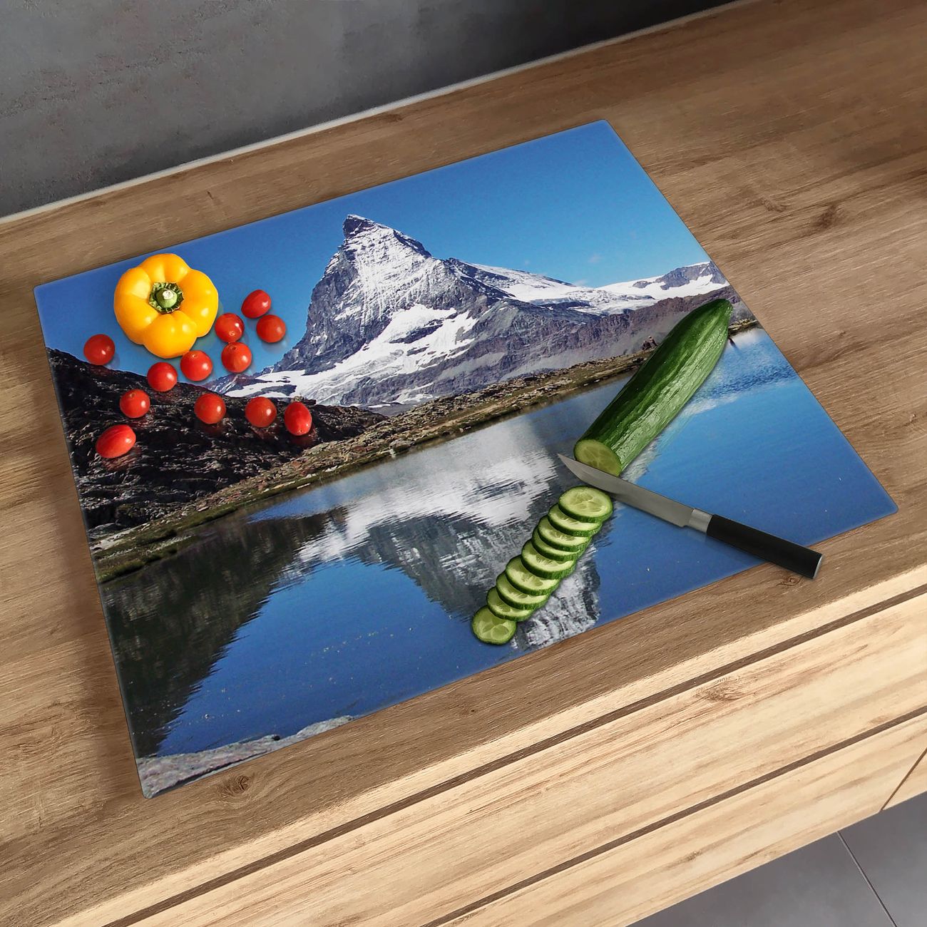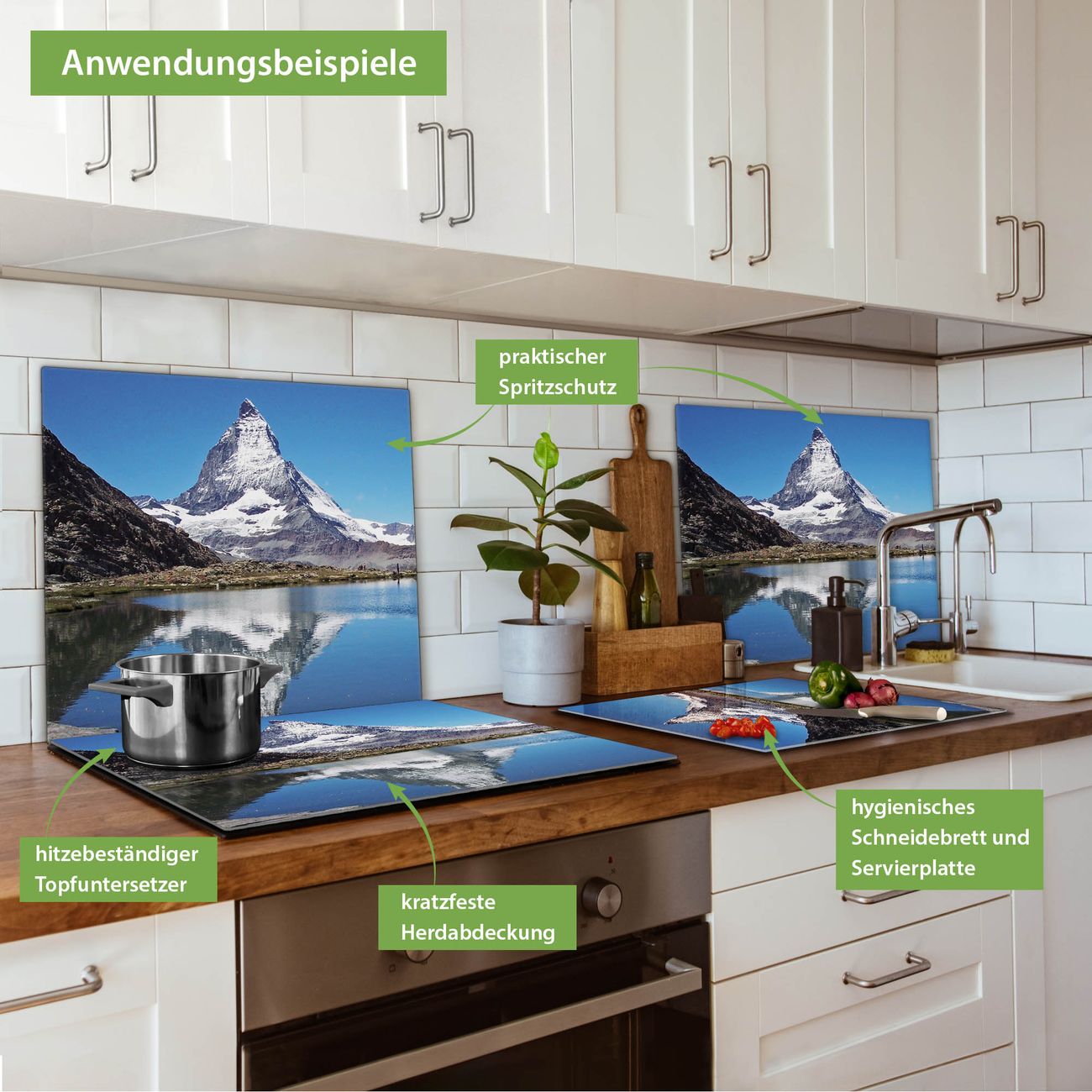 FUNKTION: Das banjado Schneidebrett mit Motiv Matterhorn ist groß und rutschfest und damit ideal für Ihre Küche. Besonders praktisch. Das Schneidebrett ist vielseitig einsetzbar: ob als Spritzschutz hinter dem Herd für Ihre Küche oder als Glas Schneidebrett als hygienische und geruchsneutrale Unterlage. Sie können ebenfalls heiße Töpfe und Pfannen bis 100°C auf der Herdplattenabdeckung abstellen. Sie erhalten ein Multitalent für Ihre Küche. QUALITÄT: Die Schneideplatte Glas besteht aus hochwertigem, gehärtetem und hitzebeständigem Glas. Wählen Sie aus einem unserer zahlreichen Motive das passende Design für Ihre Küche aus. DETAILS: Das Schneidebrett Glas groß ist in verschiedenen Größen verfügbar. Sie erhalten separate Gumminoppen damit Ihr großes Schneidebrett rutschfest in der Küche steht. VIELSEITIG: Das Schneidebrett modern ist ein Allrounder - als Schneideunterlage Küche direkt auf dem Herd oder separat und als Spritzschutz an der Wand aufgestellt - ein praktisches Küchenutensil. BANJADO: Auf Wunsch fertigen wir das Glas Schneide Brett auch als Sondergröße an. Mehrteilige Platten sind auch möglich. Kontaktieren Sie uns gern für eine Spezialanfertigung Ihrer Glasplatte Küche.