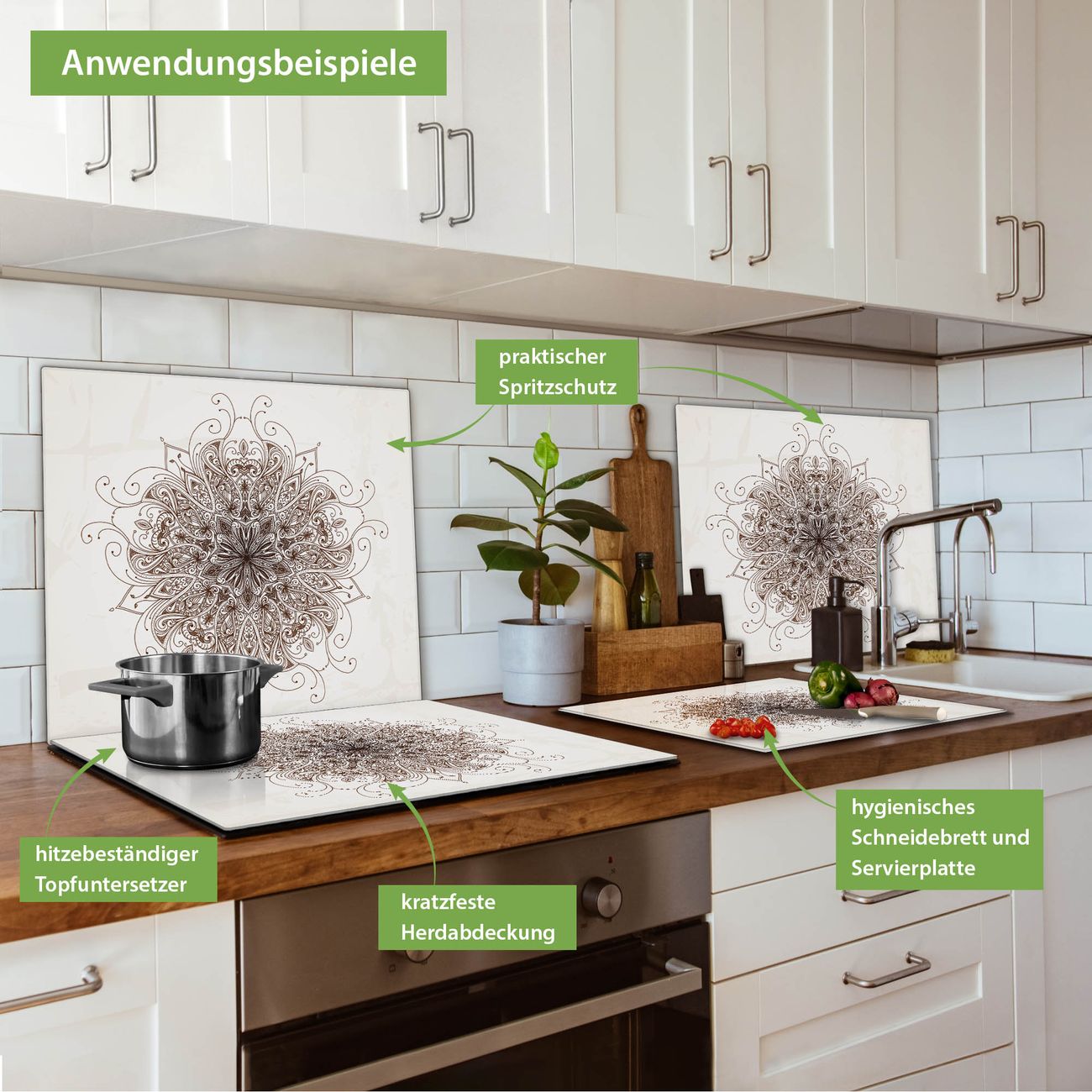 FUNKTION: Das banjado Schneidebrett mit Motiv Mehendi ist groß und rutschfest und damit ideal für Ihre Küche. Besonders praktisch. Das Schneidebrett ist vielseitig einsetzbar: ob als Spritzschutz hinter dem Herd für Ihre Küche oder als Glas Schneidebrett als hygienische und geruchsneutrale Unterlage. Sie können ebenfalls heiße Töpfe und Pfannen bis 100°C auf der Herdplattenabdeckung abstellen. Sie erhalten ein Multitalent für Ihre Küche. QUALITÄT: Die Schneideplatte Glas besteht aus hochwertigem, gehärtetem und hitzebeständigem Glas. Wählen Sie aus einem unserer zahlreichen Motive das passende Design für Ihre Küche aus. DETAILS: Das Schneidebrett Glas groß ist in verschiedenen Größen verfügbar. Sie erhalten separate Gumminoppen damit Ihr großes Schneidebrett rutschfest in der Küche steht. VIELSEITIG: Das Schneidebrett modern ist ein Allrounder - als Schneideunterlage Küche direkt auf dem Herd oder separat und als Spritzschutz an der Wand aufgestellt - ein praktisches Küchenutensil. BANJADO: Auf Wunsch fertigen wir das Glas Schneide Brett auch als Sondergröße an. Mehrteilige Platten sind auch möglich. Kontaktieren Sie uns gern für eine Spezialanfertigung Ihrer Glasplatte Küche.