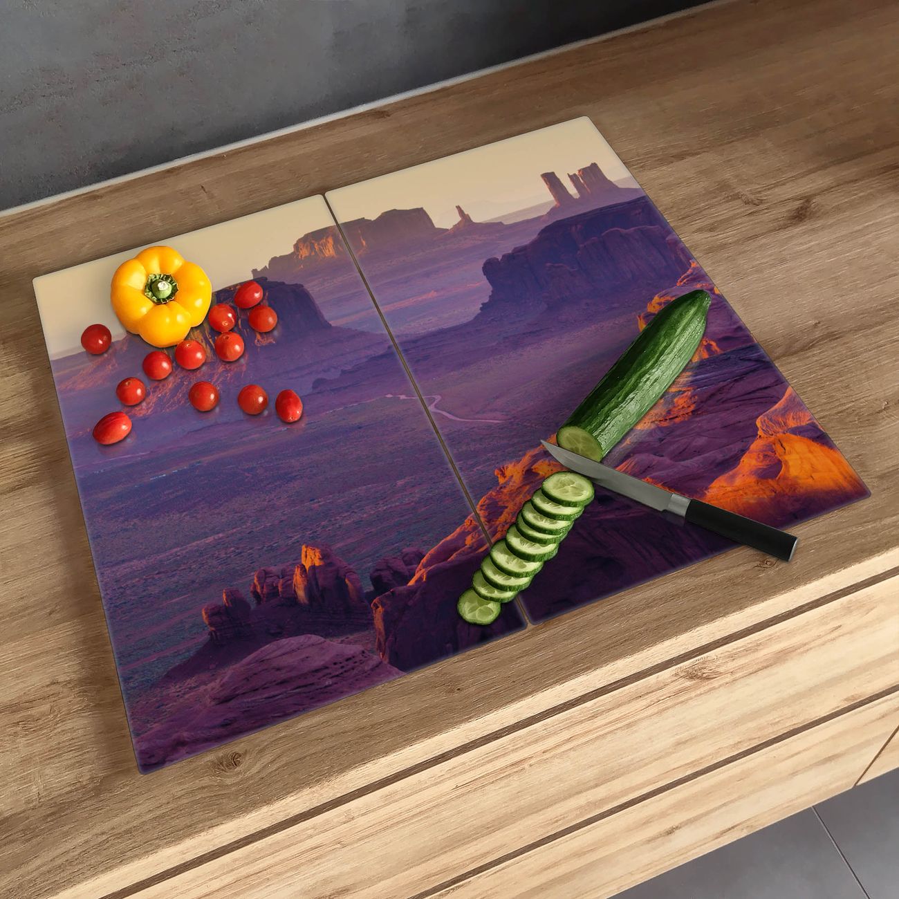 FUNKTION: Das banjado Schneidebrett mit Motiv Monument Valley ist groß und rutschfest und damit ideal für Ihre Küche. Besonders praktisch. Das Schneidebrett ist vielseitig einsetzbar: ob als Spritzschutz hinter dem Herd für Ihre Küche oder als Glas Schneidebrett als hygienische und geruchsneutrale Unterlage. Sie können ebenfalls heiße Töpfe und Pfannen bis 100°C auf der Herdplattenabdeckung abstellen. Sie erhalten ein Multitalent für Ihre Küche. QUALITÄT: Die Schneideplatte Glas besteht aus hochwertigem, gehärtetem und hitzebeständigem Glas. Wählen Sie aus einem unserer zahlreichen Motive das passende Design für Ihre Küche aus. DETAILS: Das Schneidebrett Glas groß ist in verschiedenen Größen verfügbar. Sie erhalten separate Gumminoppen damit Ihr großes Schneidebrett rutschfest in der Küche steht. VIELSEITIG: Das Schneidebrett modern ist ein Allrounder - als Schneideunterlage Küche direkt auf dem Herd oder separat und als Spritzschutz an der Wand aufgestellt - ein praktisches Küchenutensil. BANJADO: Auf Wunsch fertigen wir das Glas Schneide Brett auch als Sondergröße an. Mehrteilige Platten sind auch möglich. Kontaktieren Sie uns gern für eine Spezialanfertigung Ihrer Glasplatte Küche.