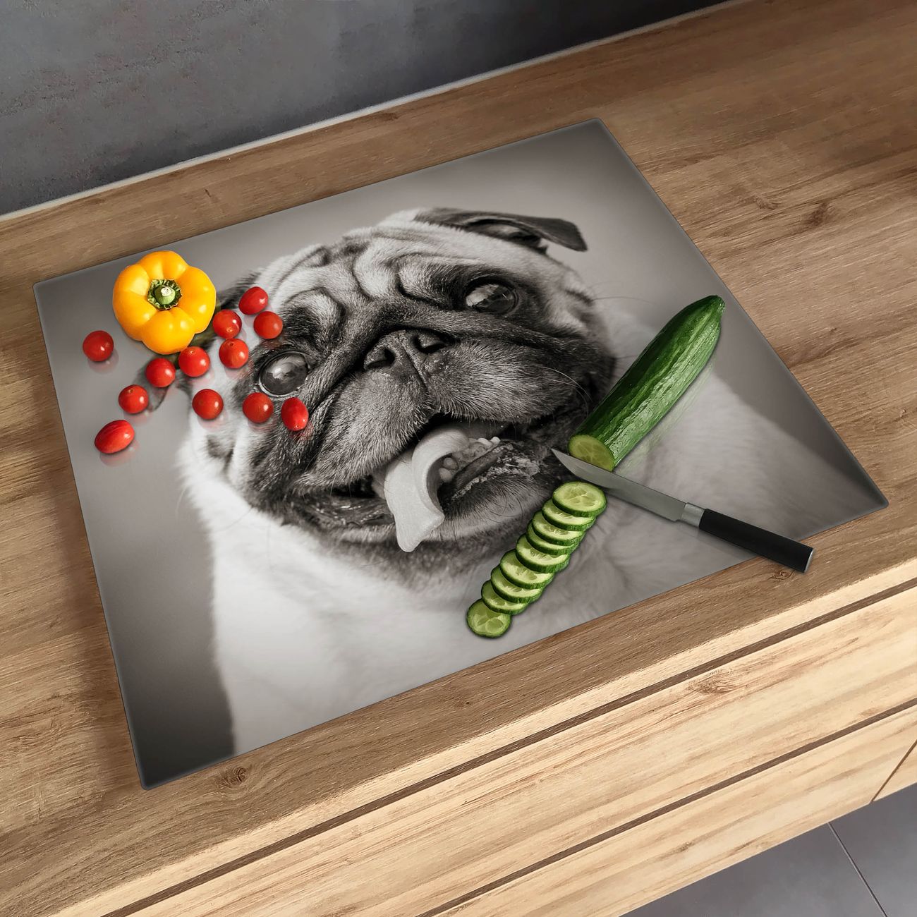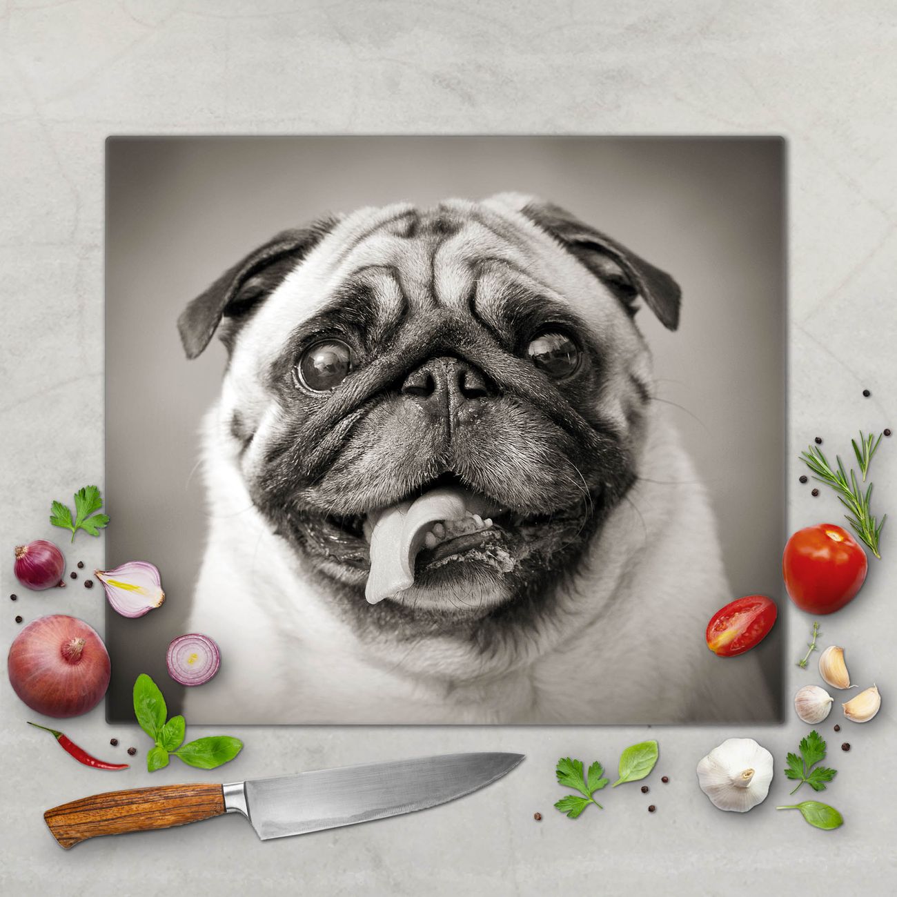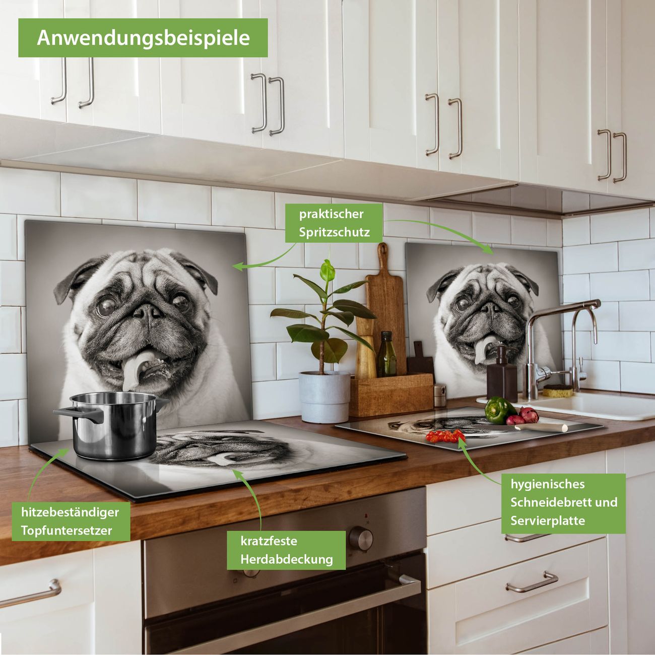 FUNKTION: Das banjado Schneidebrett mit Motiv Mops Porträt ist groß und rutschfest und damit ideal für Ihre Küche. Besonders praktisch. Das Schneidebrett ist vielseitig einsetzbar: ob als Spritzschutz hinter dem Herd für Ihre Küche oder als Glas Schneidebrett als hygienische und geruchsneutrale Unterlage. Sie können ebenfalls heiße Töpfe und Pfannen bis 100°C auf der Herdplattenabdeckung abstellen. Sie erhalten ein Multitalent für Ihre Küche. QUALITÄT: Die Schneideplatte Glas besteht aus hochwertigem, gehärtetem und hitzebeständigem Glas. Wählen Sie aus einem unserer zahlreichen Motive das passende Design für Ihre Küche aus. DETAILS: Das Schneidebrett Glas groß ist in verschiedenen Größen verfügbar. Sie erhalten separate Gumminoppen damit Ihr großes Schneidebrett rutschfest in der Küche steht. VIELSEITIG: Das Schneidebrett modern ist ein Allrounder - als Schneideunterlage Küche direkt auf dem Herd oder separat und als Spritzschutz an der Wand aufgestellt - ein praktisches Küchenutensil. BANJADO: Auf Wunsch fertigen wir das Glas Schneide Brett auch als Sondergröße an. Mehrteilige Platten sind auch möglich. Kontaktieren Sie uns gern für eine Spezialanfertigung Ihrer Glasplatte Küche.