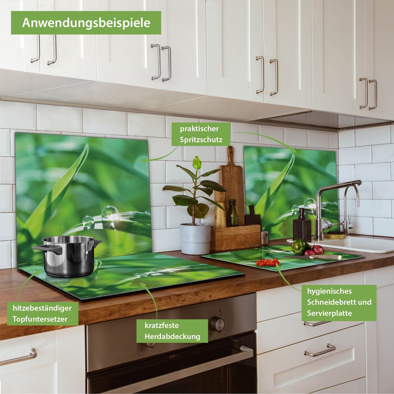 FUNKTION: Das banjado Schneidebrett mit Motiv Morgentau ist groß und rutschfest und damit ideal für Ihre Küche. Besonders praktisch. Das Schneidebrett ist vielseitig einsetzbar: ob als Spritzschutz hinter dem Herd für Ihre Küche oder als Glas Schneidebrett als hygienische und geruchsneutrale Unterlage. Sie können ebenfalls heiße Töpfe und Pfannen bis 100°C auf der Herdplattenabdeckung abstellen. Sie erhalten ein Multitalent für Ihre Küche. QUALITÄT: Die Schneideplatte Glas besteht aus hochwertigem, gehärtetem und hitzebeständigem Glas. Wählen Sie aus einem unserer zahlreichen Motive das passende Design für Ihre Küche aus. DETAILS: Das Schneidebrett Glas groß ist in verschiedenen Größen verfügbar. Sie erhalten separate Gumminoppen damit Ihr großes Schneidebrett rutschfest in der Küche steht. VIELSEITIG: Das Schneidebrett modern ist ein Allrounder - als Schneideunterlage Küche direkt auf dem Herd oder separat und als Spritzschutz an der Wand aufgestellt - ein praktisches Küchenutensil. BANJADO: Auf Wunsch fertigen wir das Glas Schneide Brett auch als Sondergröße an. Mehrteilige Platten sind auch möglich. Kontaktieren Sie uns gern für eine Spezialanfertigung Ihrer Glasplatte Küche.