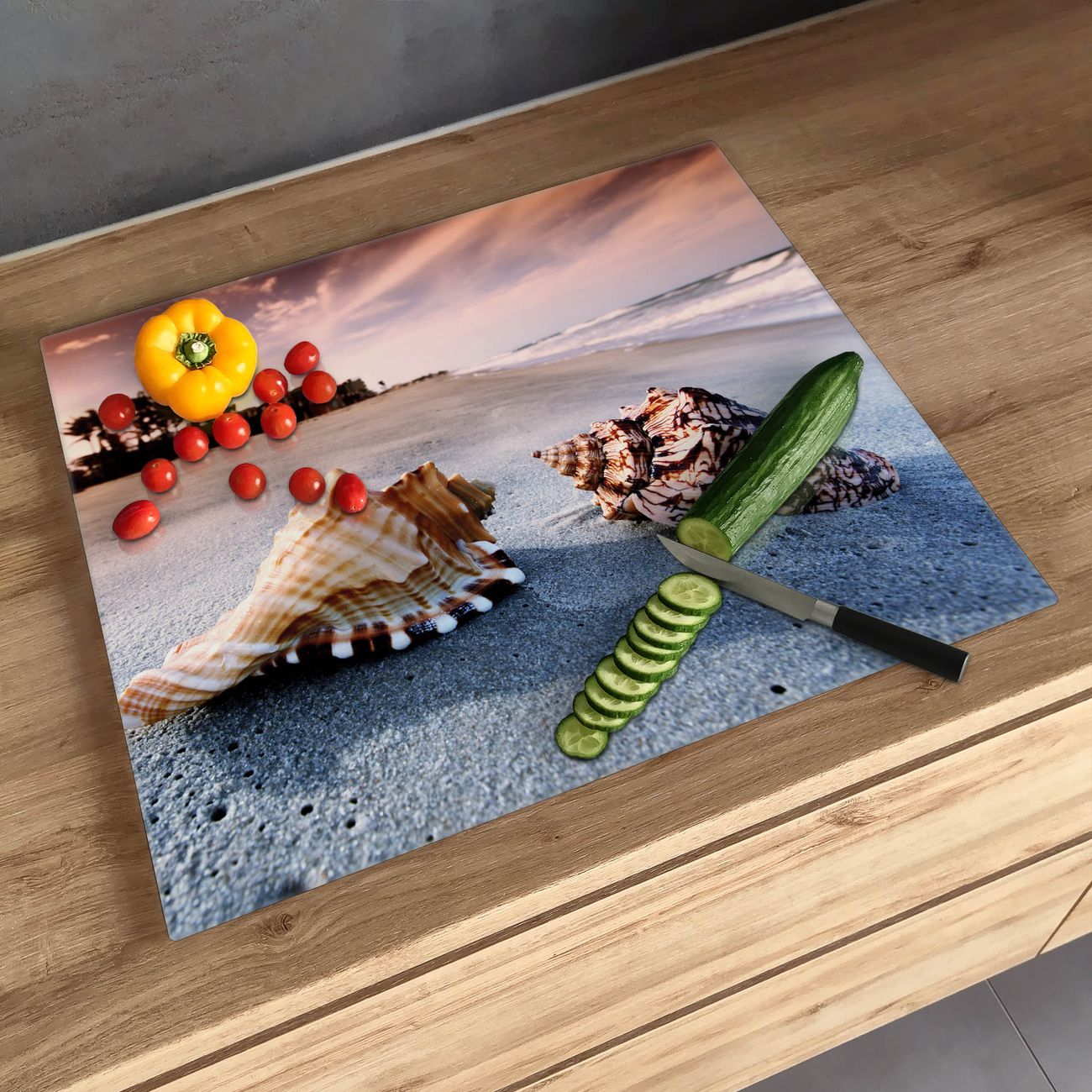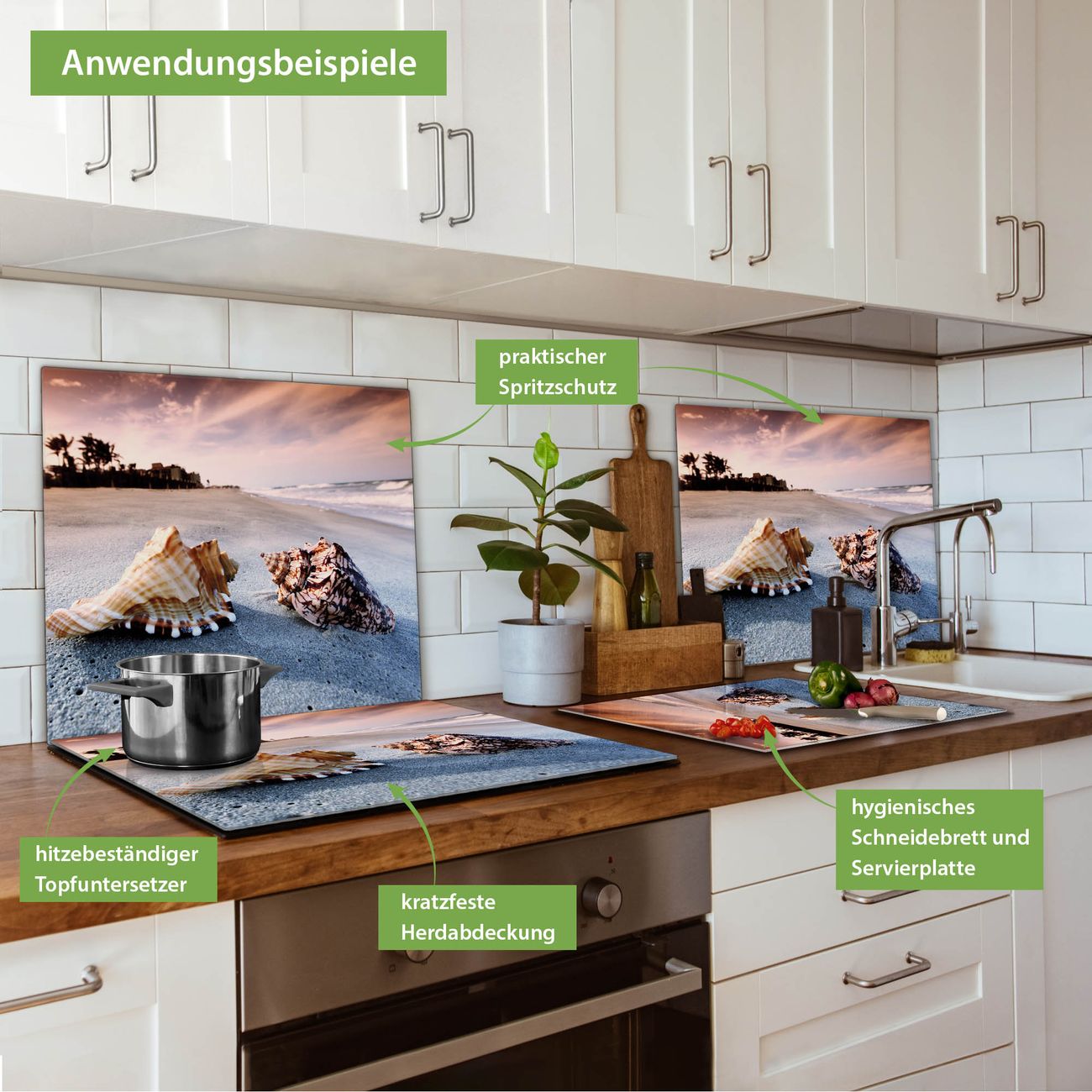 FUNKTION: Das banjado Schneidebrett mit Motiv Muscheln ist groß und rutschfest und damit ideal für Ihre Küche. Besonders praktisch. Das Schneidebrett ist vielseitig einsetzbar: ob als Spritzschutz hinter dem Herd für Ihre Küche oder als Glas Schneidebrett als hygienische und geruchsneutrale Unterlage. Sie können ebenfalls heiße Töpfe und Pfannen bis 100°C auf der Herdplattenabdeckung abstellen. Sie erhalten ein Multitalent für Ihre Küche. QUALITÄT: Die Schneideplatte Glas besteht aus hochwertigem, gehärtetem und hitzebeständigem Glas. Wählen Sie aus einem unserer zahlreichen Motive das passende Design für Ihre Küche aus. DETAILS: Das Schneidebrett Glas groß ist in verschiedenen Größen verfügbar. Sie erhalten separate Gumminoppen damit Ihr großes Schneidebrett rutschfest in der Küche steht. VIELSEITIG: Das Schneidebrett modern ist ein Allrounder - als Schneideunterlage Küche direkt auf dem Herd oder separat und als Spritzschutz an der Wand aufgestellt - ein praktisches Küchenutensil. BANJADO: Auf Wunsch fertigen wir das Glas Schneide Brett auch als Sondergröße an. Mehrteilige Platten sind auch möglich. Kontaktieren Sie uns gern für eine Spezialanfertigung Ihrer Glasplatte Küche.