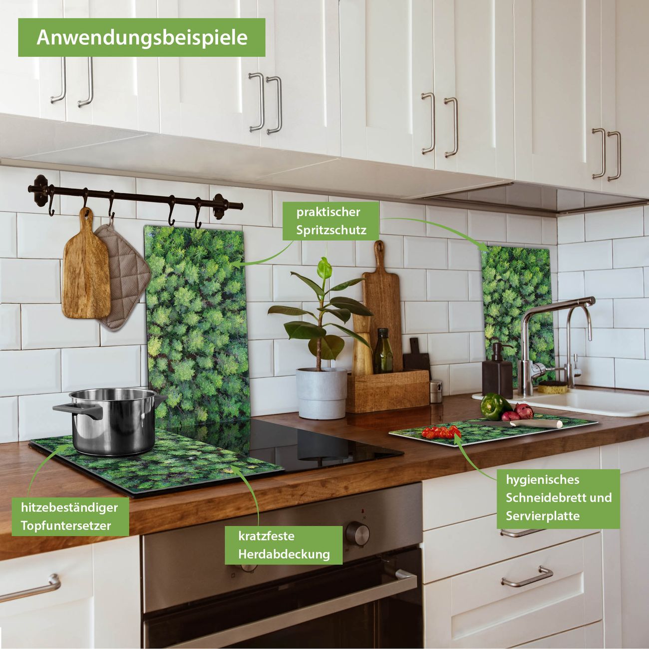 FUNKTION: Das banjado Schneidebrett mit Motiv Nadelwald ist groß und rutschfest und damit ideal für Ihre Küche. Besonders praktisch. Das Schneidebrett ist vielseitig einsetzbar: ob als Spritzschutz hinter dem Herd für Ihre Küche oder als Glas Schneidebrett als hygienische und geruchsneutrale Unterlage. Sie können ebenfalls heiße Töpfe und Pfannen bis 100°C auf der Herdplattenabdeckung abstellen. Sie erhalten ein Multitalent für Ihre Küche. QUALITÄT: Die Schneideplatte Glas besteht aus hochwertigem, gehärtetem und hitzebeständigem Glas. Wählen Sie aus einem unserer zahlreichen Motive das passende Design für Ihre Küche aus. DETAILS: Das Schneidebrett Glas groß ist in verschiedenen Größen verfügbar. Sie erhalten separate Gumminoppen damit Ihr großes Schneidebrett rutschfest in der Küche steht. VIELSEITIG: Das Schneidebrett modern ist ein Allrounder - als Schneideunterlage Küche direkt auf dem Herd oder separat und als Spritzschutz an der Wand aufgestellt - ein praktisches Küchenutensil. BANJADO: Auf Wunsch fertigen wir das Glas Schneide Brett auch als Sondergröße an. Mehrteilige Platten sind auch möglich. Kontaktieren Sie uns gern für eine Spezialanfertigung Ihrer Glasplatte Küche.