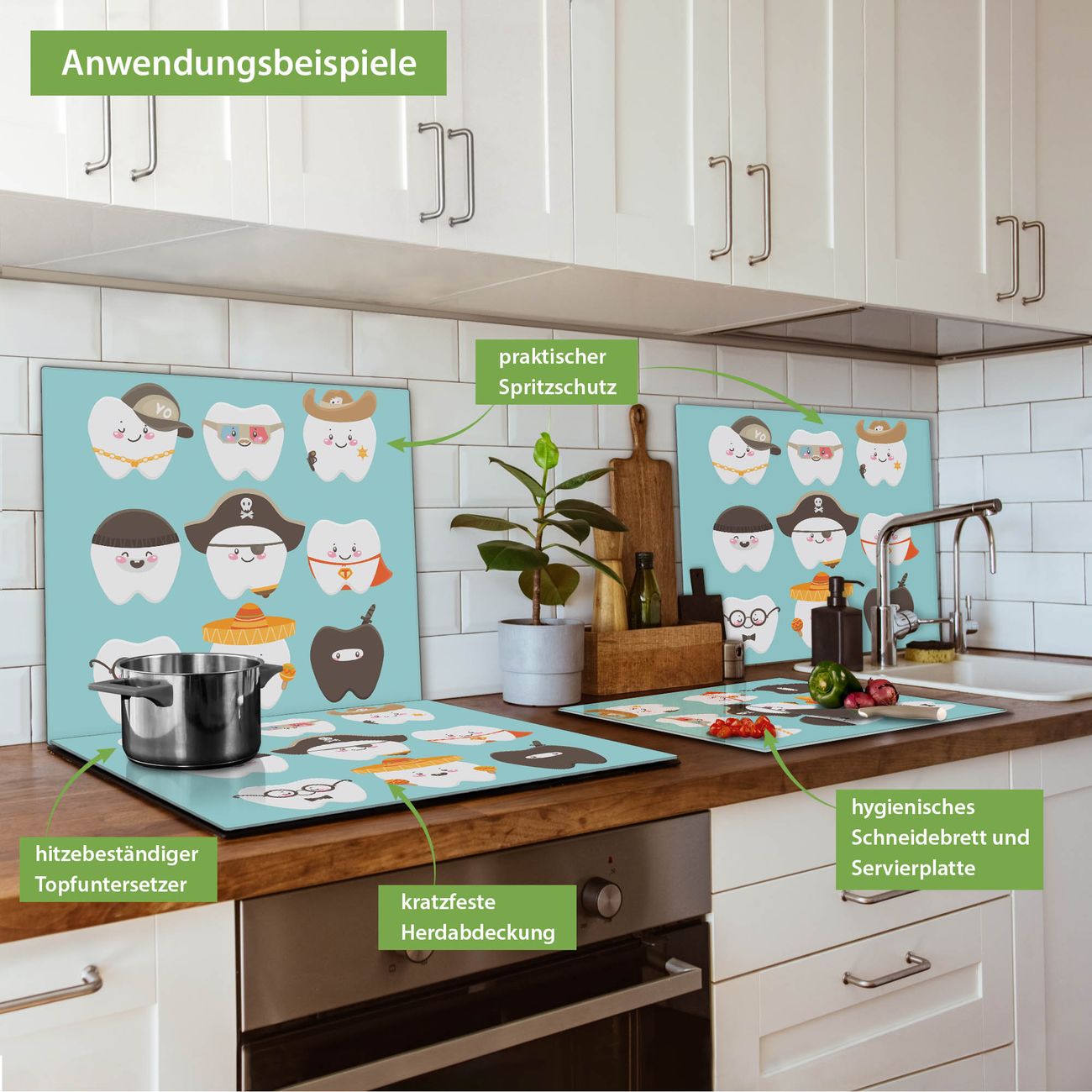 FUNKTION: Das banjado Schneidebrett mit Motiv Neun Zähne ist groß und rutschfest und damit ideal für Ihre Küche. Besonders praktisch. Das Schneidebrett ist vielseitig einsetzbar: ob als Spritzschutz hinter dem Herd für Ihre Küche oder als Glas Schneidebrett als hygienische und geruchsneutrale Unterlage. Sie können ebenfalls heiße Töpfe und Pfannen bis 100°C auf der Herdplattenabdeckung abstellen. Sie erhalten ein Multitalent für Ihre Küche. QUALITÄT: Die Schneideplatte Glas besteht aus hochwertigem, gehärtetem und hitzebeständigem Glas. Wählen Sie aus einem unserer zahlreichen Motive das passende Design für Ihre Küche aus. DETAILS: Das Schneidebrett Glas groß ist in verschiedenen Größen verfügbar. Sie erhalten separate Gumminoppen damit Ihr großes Schneidebrett rutschfest in der Küche steht. VIELSEITIG: Das Schneidebrett modern ist ein Allrounder - als Schneideunterlage Küche direkt auf dem Herd oder separat und als Spritzschutz an der Wand aufgestellt - ein praktisches Küchenutensil. BANJADO: Auf Wunsch fertigen wir das Glas Schneide Brett auch als Sondergröße an. Mehrteilige Platten sind auch möglich. Kontaktieren Sie uns gern für eine Spezialanfertigung Ihrer Glasplatte Küche.