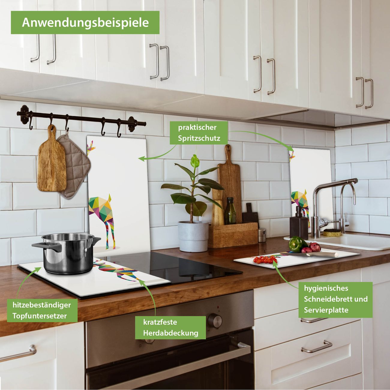 FUNKTION: Das banjado Schneidebrett mit Motiv Origami Hirsch ist groß und rutschfest und damit ideal für Ihre Küche. Besonders praktisch. Das Schneidebrett ist vielseitig einsetzbar: ob als Spritzschutz hinter dem Herd für Ihre Küche oder als Glas Schneidebrett als hygienische und geruchsneutrale Unterlage. Sie können ebenfalls heiße Töpfe und Pfannen bis 100°C auf der Herdplattenabdeckung abstellen. Sie erhalten ein Multitalent für Ihre Küche. QUALITÄT: Die Schneideplatte Glas besteht aus hochwertigem, gehärtetem und hitzebeständigem Glas. Wählen Sie aus einem unserer zahlreichen Motive das passende Design für Ihre Küche aus. DETAILS: Das Schneidebrett Glas groß ist in verschiedenen Größen verfügbar. Sie erhalten separate Gumminoppen damit Ihr großes Schneidebrett rutschfest in der Küche steht. VIELSEITIG: Das Schneidebrett modern ist ein Allrounder - als Schneideunterlage Küche direkt auf dem Herd oder separat und als Spritzschutz an der Wand aufgestellt - ein praktisches Küchenutensil. BANJADO: Auf Wunsch fertigen wir das Glas Schneide Brett auch als Sondergröße an. Mehrteilige Platten sind auch möglich. Kontaktieren Sie uns gern für eine Spezialanfertigung Ihrer Glasplatte Küche.