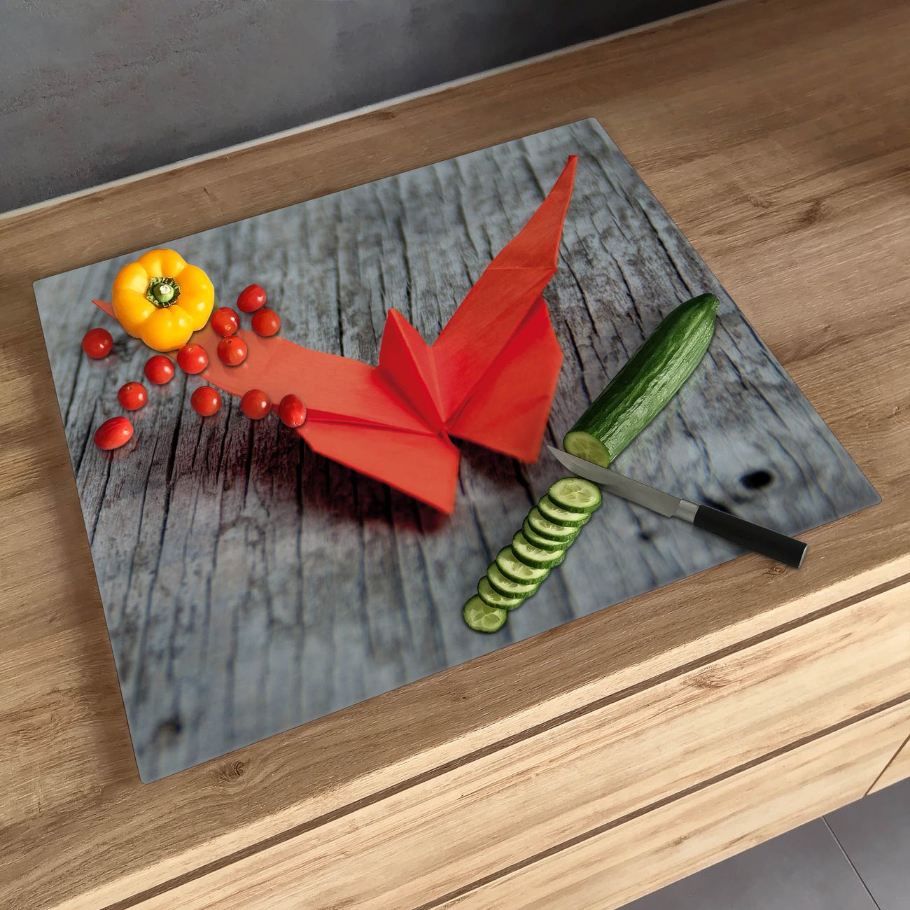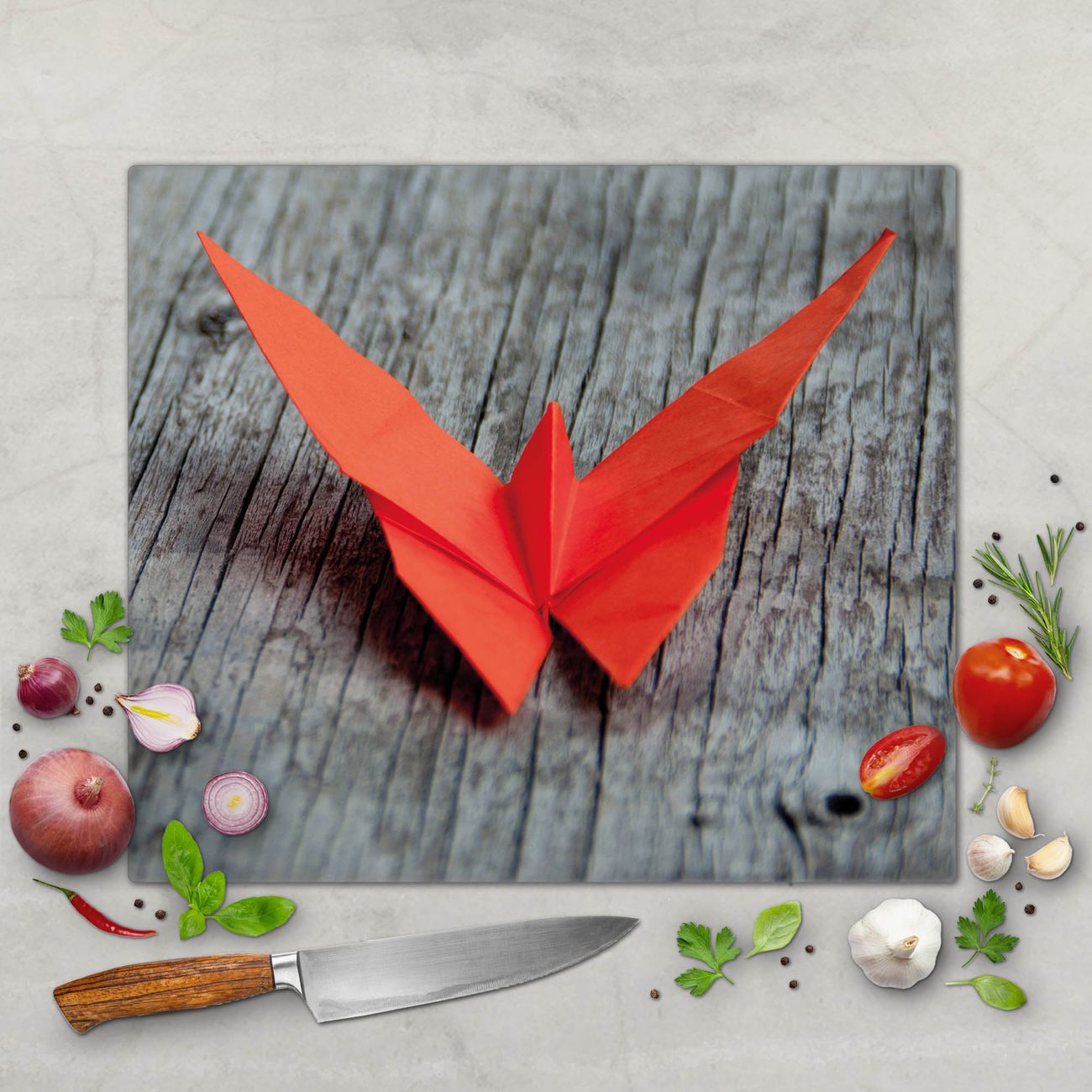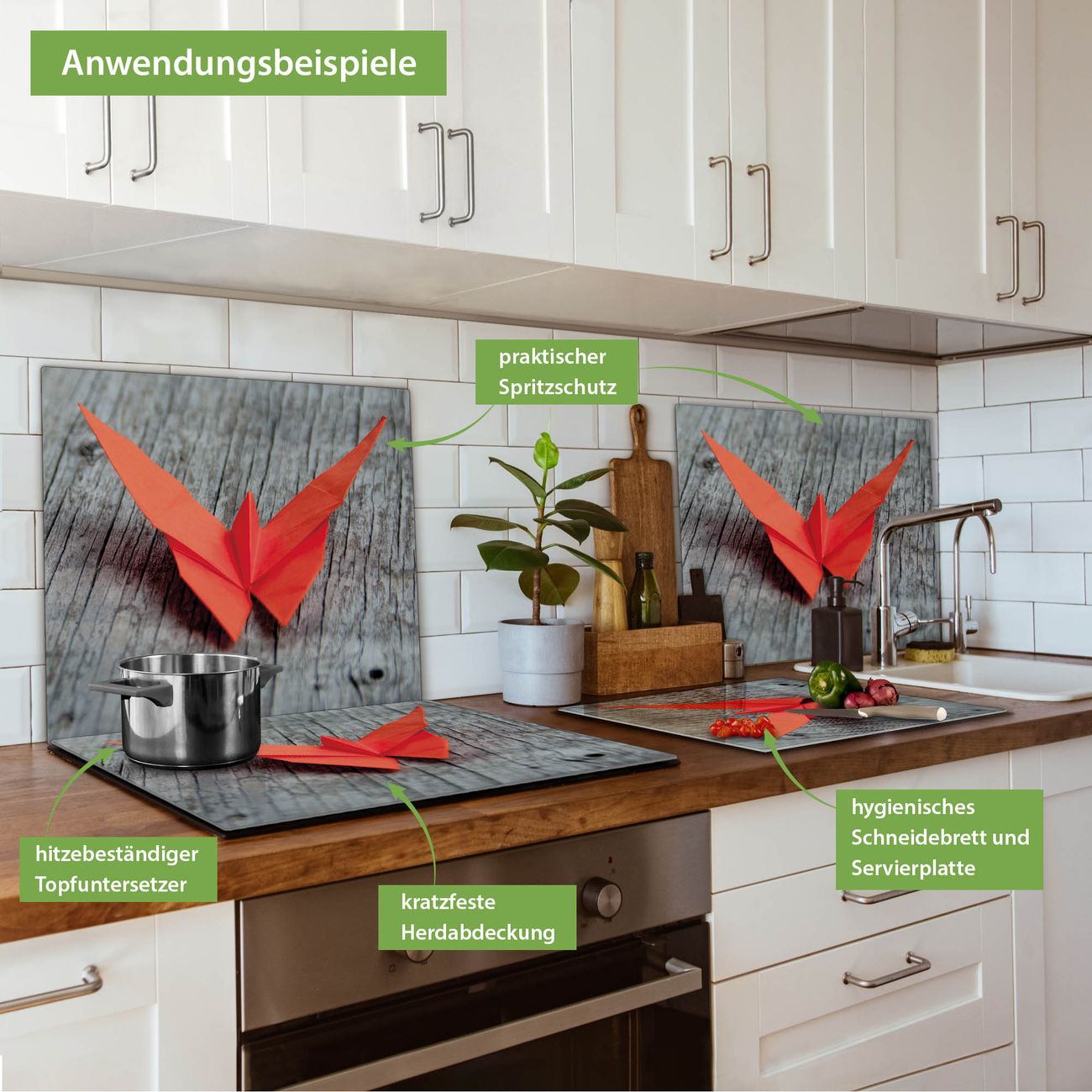 FUNKTION: Das banjado Schneidebrett mit Motiv Origami Schmetterling ist groß und rutschfest und damit ideal für Ihre Küche. Besonders praktisch. Das Schneidebrett ist vielseitig einsetzbar: ob als Spritzschutz hinter dem Herd für Ihre Küche oder als Glas Schneidebrett als hygienische und geruchsneutrale Unterlage. Sie können ebenfalls heiße Töpfe und Pfannen bis 100°C auf der Herdplattenabdeckung abstellen. Sie erhalten ein Multitalent für Ihre Küche. QUALITÄT: Die Schneideplatte Glas besteht aus hochwertigem, gehärtetem und hitzebeständigem Glas. Wählen Sie aus einem unserer zahlreichen Motive das passende Design für Ihre Küche aus. DETAILS: Das Schneidebrett Glas groß ist in verschiedenen Größen verfügbar. Sie erhalten separate Gumminoppen damit Ihr großes Schneidebrett rutschfest in der Küche steht. VIELSEITIG: Das Schneidebrett modern ist ein Allrounder - als Schneideunterlage Küche direkt auf dem Herd oder separat und als Spritzschutz an der Wand aufgestellt - ein praktisches Küchenutensil. BANJADO: Auf Wunsch fertigen wir das Glas Schneide Brett auch als Sondergröße an. Mehrteilige Platten sind auch möglich. Kontaktieren Sie uns gern für eine Spezialanfertigung Ihrer Glasplatte Küche.