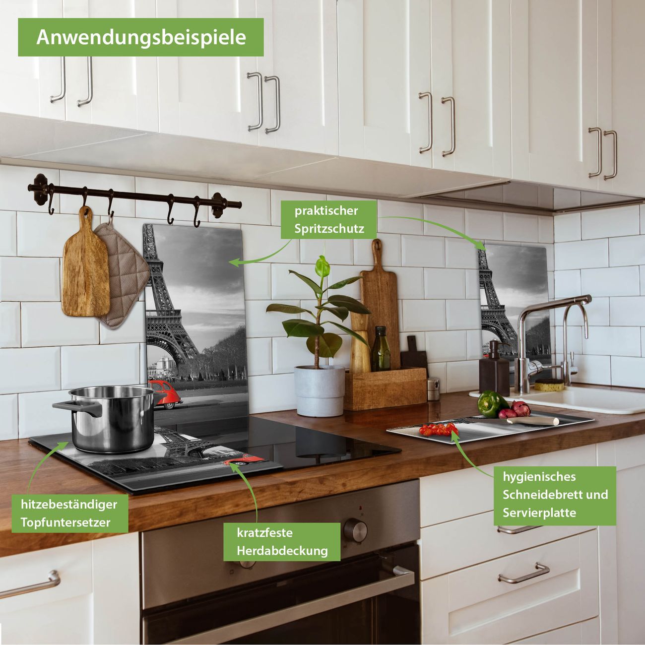 FUNKTION: Das banjado Schneidebrett mit Motiv Paris ist groß und rutschfest und damit ideal für Ihre Küche. Besonders praktisch. Das Schneidebrett ist vielseitig einsetzbar: ob als Spritzschutz hinter dem Herd für Ihre Küche oder als Glas Schneidebrett als hygienische und geruchsneutrale Unterlage. Sie können ebenfalls heiße Töpfe und Pfannen bis 100°C auf der Herdplattenabdeckung abstellen. Sie erhalten ein Multitalent für Ihre Küche. QUALITÄT: Die Schneideplatte Glas besteht aus hochwertigem, gehärtetem und hitzebeständigem Glas. Wählen Sie aus einem unserer zahlreichen Motive das passende Design für Ihre Küche aus. DETAILS: Das Schneidebrett Glas groß ist in verschiedenen Größen verfügbar. Sie erhalten separate Gumminoppen damit Ihr großes Schneidebrett rutschfest in der Küche steht. VIELSEITIG: Das Schneidebrett modern ist ein Allrounder - als Schneideunterlage Küche direkt auf dem Herd oder separat und als Spritzschutz an der Wand aufgestellt - ein praktisches Küchenutensil. BANJADO: Auf Wunsch fertigen wir das Glas Schneide Brett auch als Sondergröße an. Mehrteilige Platten sind auch möglich. Kontaktieren Sie uns gern für eine Spezialanfertigung Ihrer Glasplatte Küche.
