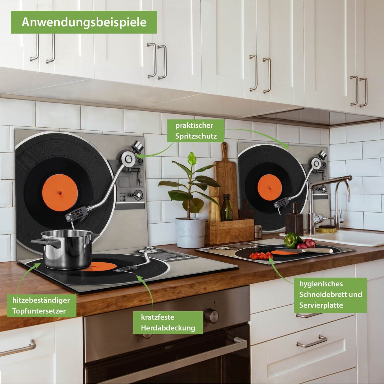 FUNKTION: Das banjado Schneidebrett mit Motiv Plattenspieler ist groß und rutschfest und damit ideal für Ihre Küche. Besonders praktisch. Das Schneidebrett ist vielseitig einsetzbar: ob als Spritzschutz hinter dem Herd für Ihre Küche oder als Glas Schneidebrett als hygienische und geruchsneutrale Unterlage. Sie können ebenfalls heiße Töpfe und Pfannen bis 100°C auf der Herdplattenabdeckung abstellen. Sie erhalten ein Multitalent für Ihre Küche. QUALITÄT: Die Schneideplatte Glas besteht aus hochwertigem, gehärtetem und hitzebeständigem Glas. Wählen Sie aus einem unserer zahlreichen Motive das passende Design für Ihre Küche aus. DETAILS: Das Schneidebrett Glas groß ist in verschiedenen Größen verfügbar. Sie erhalten separate Gumminoppen damit Ihr großes Schneidebrett rutschfest in der Küche steht. VIELSEITIG: Das Schneidebrett modern ist ein Allrounder - als Schneideunterlage Küche direkt auf dem Herd oder separat und als Spritzschutz an der Wand aufgestellt - ein praktisches Küchenutensil. BANJADO: Auf Wunsch fertigen wir das Glas Schneide Brett auch als Sondergröße an. Mehrteilige Platten sind auch möglich. Kontaktieren Sie uns gern für eine Spezialanfertigung Ihrer Glasplatte Küche.