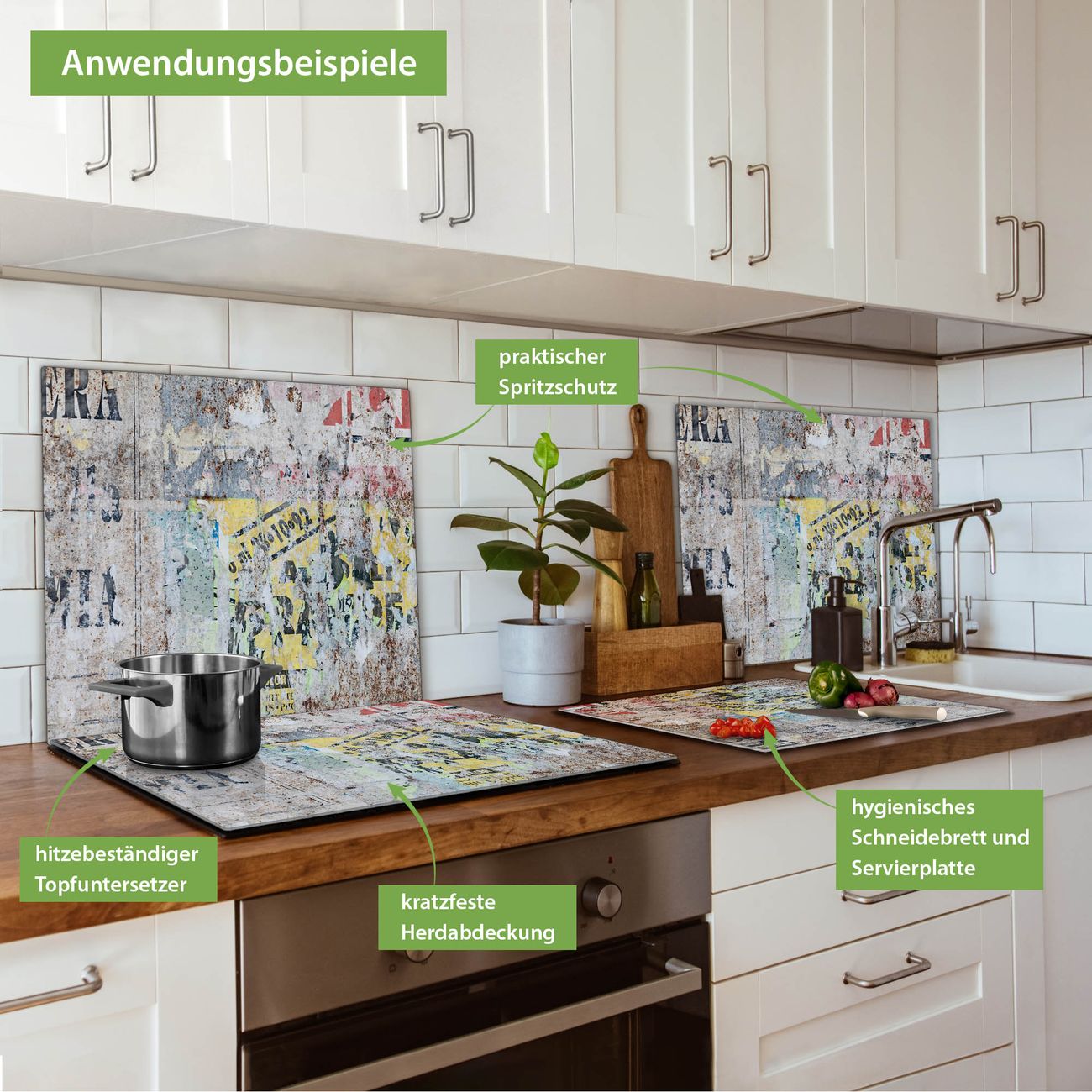 FUNKTION: Das banjado Schneidebrett mit Motiv Posterwand ist groß und rutschfest und damit ideal für Ihre Küche. Besonders praktisch. Das Schneidebrett ist vielseitig einsetzbar: ob als Spritzschutz hinter dem Herd für Ihre Küche oder als Glas Schneidebrett als hygienische und geruchsneutrale Unterlage. Sie können ebenfalls heiße Töpfe und Pfannen bis 100°C auf der Herdplattenabdeckung abstellen. Sie erhalten ein Multitalent für Ihre Küche. QUALITÄT: Die Schneideplatte Glas besteht aus hochwertigem, gehärtetem und hitzebeständigem Glas. Wählen Sie aus einem unserer zahlreichen Motive das passende Design für Ihre Küche aus. DETAILS: Das Schneidebrett Glas groß ist in verschiedenen Größen verfügbar. Sie erhalten separate Gumminoppen damit Ihr großes Schneidebrett rutschfest in der Küche steht. VIELSEITIG: Das Schneidebrett modern ist ein Allrounder - als Schneideunterlage Küche direkt auf dem Herd oder separat und als Spritzschutz an der Wand aufgestellt - ein praktisches Küchenutensil. BANJADO: Auf Wunsch fertigen wir das Glas Schneide Brett auch als Sondergröße an. Mehrteilige Platten sind auch möglich. Kontaktieren Sie uns gern für eine Spezialanfertigung Ihrer Glasplatte Küche.