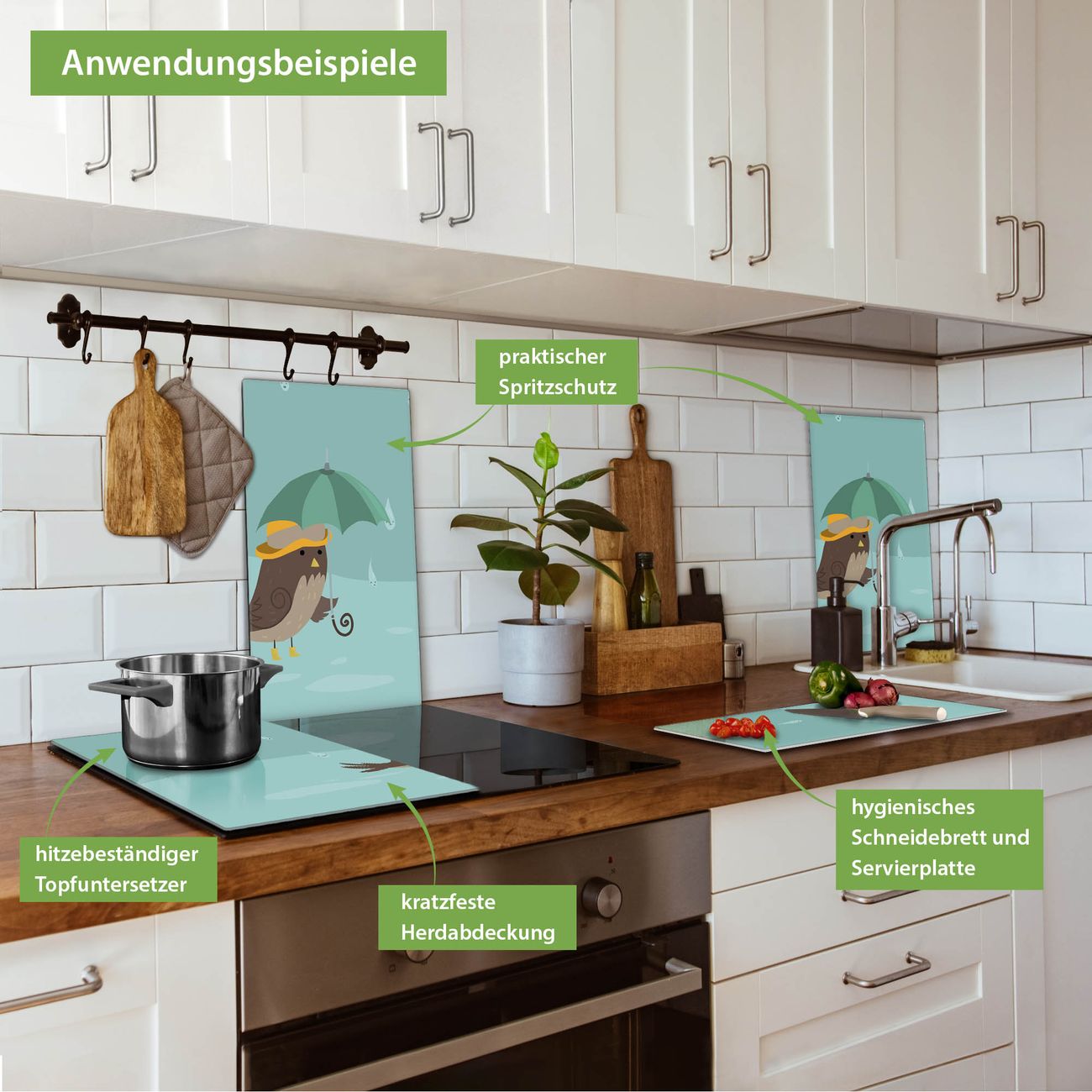 FUNKTION: Das banjado Schneidebrett mit Motiv Rainbird ist groß und rutschfest und damit ideal für Ihre Küche. Besonders praktisch. Das Schneidebrett ist vielseitig einsetzbar: ob als Spritzschutz hinter dem Herd für Ihre Küche oder als Glas Schneidebrett als hygienische und geruchsneutrale Unterlage. Sie können ebenfalls heiße Töpfe und Pfannen bis 100°C auf der Herdplattenabdeckung abstellen. Sie erhalten ein Multitalent für Ihre Küche. QUALITÄT: Die Schneideplatte Glas besteht aus hochwertigem, gehärtetem und hitzebeständigem Glas. Wählen Sie aus einem unserer zahlreichen Motive das passende Design für Ihre Küche aus. DETAILS: Das Schneidebrett Glas groß ist in verschiedenen Größen verfügbar. Sie erhalten separate Gumminoppen damit Ihr großes Schneidebrett rutschfest in der Küche steht. VIELSEITIG: Das Schneidebrett modern ist ein Allrounder - als Schneideunterlage Küche direkt auf dem Herd oder separat und als Spritzschutz an der Wand aufgestellt - ein praktisches Küchenutensil. BANJADO: Auf Wunsch fertigen wir das Glas Schneide Brett auch als Sondergröße an. Mehrteilige Platten sind auch möglich. Kontaktieren Sie uns gern für eine Spezialanfertigung Ihrer Glasplatte Küche.