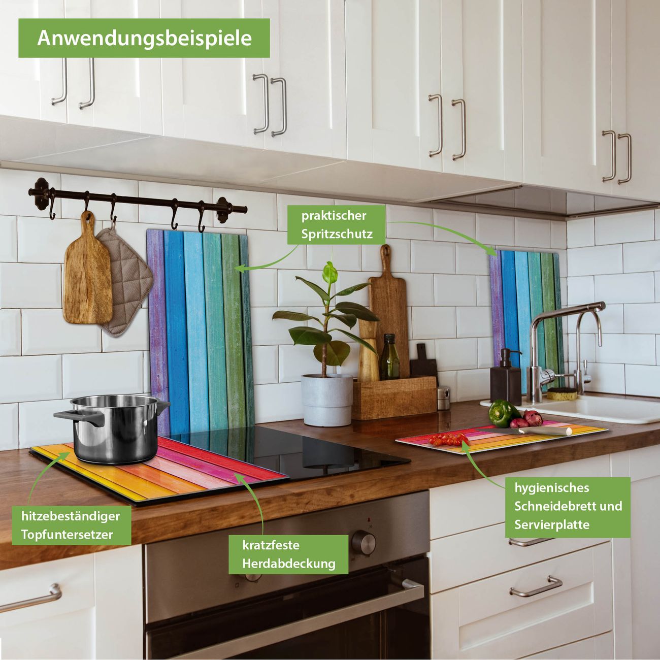 FUNKTION: Das banjado Schneidebrett mit Motiv Regenbogenfarben ist groß und rutschfest und damit ideal für Ihre Küche. Besonders praktisch. Das Schneidebrett ist vielseitig einsetzbar: ob als Spritzschutz hinter dem Herd für Ihre Küche oder als Glas Schneidebrett als hygienische und geruchsneutrale Unterlage. Sie können ebenfalls heiße Töpfe und Pfannen bis 100°C auf der Herdplattenabdeckung abstellen. Sie erhalten ein Multitalent für Ihre Küche. QUALITÄT: Die Schneideplatte Glas besteht aus hochwertigem, gehärtetem und hitzebeständigem Glas. Wählen Sie aus einem unserer zahlreichen Motive das passende Design für Ihre Küche aus. DETAILS: Das Schneidebrett Glas groß ist in verschiedenen Größen verfügbar. Sie erhalten separate Gumminoppen damit Ihr großes Schneidebrett rutschfest in der Küche steht. VIELSEITIG: Das Schneidebrett modern ist ein Allrounder - als Schneideunterlage Küche direkt auf dem Herd oder separat und als Spritzschutz an der Wand aufgestellt - ein praktisches Küchenutensil. BANJADO: Auf Wunsch fertigen wir das Glas Schneide Brett auch als Sondergröße an. Mehrteilige Platten sind auch möglich. Kontaktieren Sie uns gern für eine Spezialanfertigung Ihrer Glasplatte Küche.