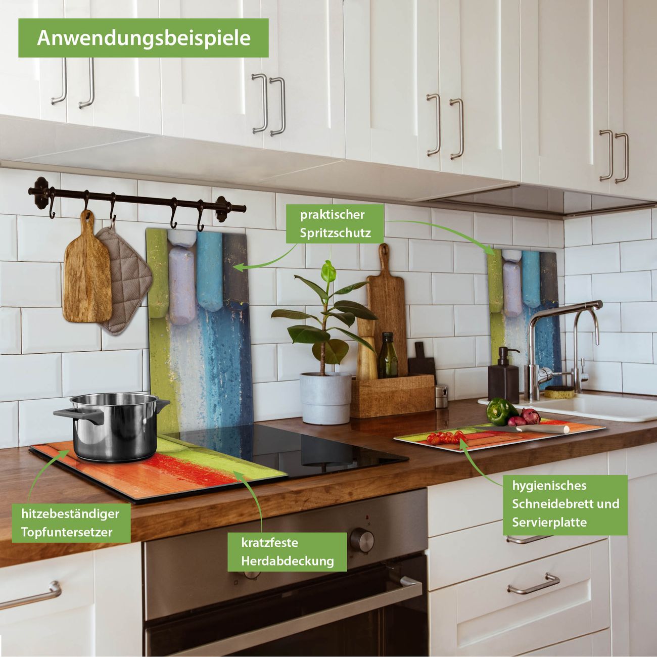 FUNKTION: Das banjado Schneidebrett mit Motiv Regenbogenkreide ist groß und rutschfest und damit ideal für Ihre Küche. Besonders praktisch. Das Schneidebrett ist vielseitig einsetzbar: ob als Spritzschutz hinter dem Herd für Ihre Küche oder als Glas Schneidebrett als hygienische und geruchsneutrale Unterlage. Sie können ebenfalls heiße Töpfe und Pfannen bis 100°C auf der Herdplattenabdeckung abstellen. Sie erhalten ein Multitalent für Ihre Küche. QUALITÄT: Die Schneideplatte Glas besteht aus hochwertigem, gehärtetem und hitzebeständigem Glas. Wählen Sie aus einem unserer zahlreichen Motive das passende Design für Ihre Küche aus. DETAILS: Das Schneidebrett Glas groß ist in verschiedenen Größen verfügbar. Sie erhalten separate Gumminoppen damit Ihr großes Schneidebrett rutschfest in der Küche steht. VIELSEITIG: Das Schneidebrett modern ist ein Allrounder - als Schneideunterlage Küche direkt auf dem Herd oder separat und als Spritzschutz an der Wand aufgestellt - ein praktisches Küchenutensil. BANJADO: Auf Wunsch fertigen wir das Glas Schneide Brett auch als Sondergröße an. Mehrteilige Platten sind auch möglich. Kontaktieren Sie uns gern für eine Spezialanfertigung Ihrer Glasplatte Küche.