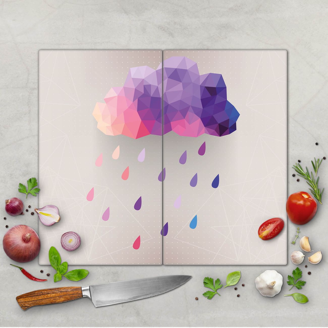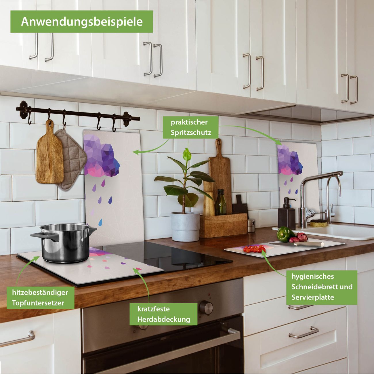 FUNKTION: Das banjado Schneidebrett mit Motiv Regenwolke ist groß und rutschfest und damit ideal für Ihre Küche. Besonders praktisch. Das Schneidebrett ist vielseitig einsetzbar: ob als Spritzschutz hinter dem Herd für Ihre Küche oder als Glas Schneidebrett als hygienische und geruchsneutrale Unterlage. Sie können ebenfalls heiße Töpfe und Pfannen bis 100°C auf der Herdplattenabdeckung abstellen. Sie erhalten ein Multitalent für Ihre Küche. QUALITÄT: Die Schneideplatte Glas besteht aus hochwertigem, gehärtetem und hitzebeständigem Glas. Wählen Sie aus einem unserer zahlreichen Motive das passende Design für Ihre Küche aus. DETAILS: Das Schneidebrett Glas groß ist in verschiedenen Größen verfügbar. Sie erhalten separate Gumminoppen damit Ihr großes Schneidebrett rutschfest in der Küche steht. VIELSEITIG: Das Schneidebrett modern ist ein Allrounder - als Schneideunterlage Küche direkt auf dem Herd oder separat und als Spritzschutz an der Wand aufgestellt - ein praktisches Küchenutensil. BANJADO: Auf Wunsch fertigen wir das Glas Schneide Brett auch als Sondergröße an. Mehrteilige Platten sind auch möglich. Kontaktieren Sie uns gern für eine Spezialanfertigung Ihrer Glasplatte Küche.