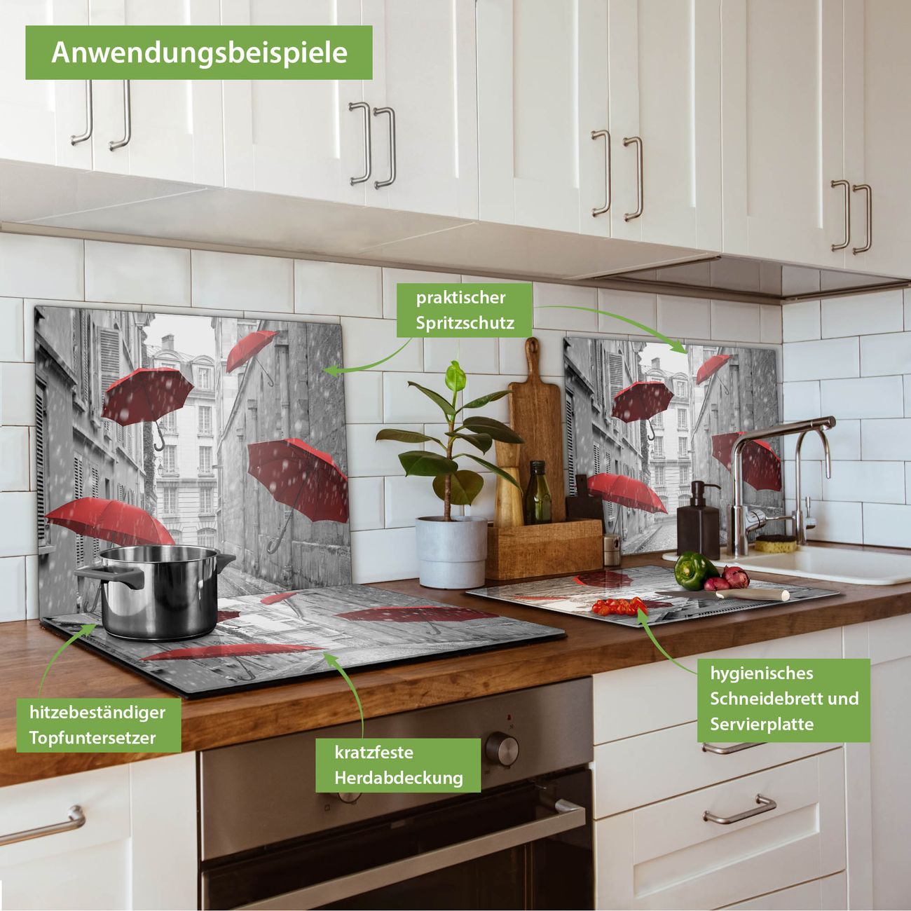 FUNKTION: Das banjado Schneidebrett mit Motiv Rote Schirme ist groß und rutschfest und damit ideal für Ihre Küche. Besonders praktisch. Das Schneidebrett ist vielseitig einsetzbar: ob als Spritzschutz hinter dem Herd für Ihre Küche oder als Glas Schneidebrett als hygienische und geruchsneutrale Unterlage. Sie können ebenfalls heiße Töpfe und Pfannen bis 100°C auf der Herdplattenabdeckung abstellen. Sie erhalten ein Multitalent für Ihre Küche. QUALITÄT: Die Schneideplatte Glas besteht aus hochwertigem, gehärtetem und hitzebeständigem Glas. Wählen Sie aus einem unserer zahlreichen Motive das passende Design für Ihre Küche aus. DETAILS: Das Schneidebrett Glas groß ist in verschiedenen Größen verfügbar. Sie erhalten separate Gumminoppen damit Ihr großes Schneidebrett rutschfest in der Küche steht. VIELSEITIG: Das Schneidebrett modern ist ein Allrounder - als Schneideunterlage Küche direkt auf dem Herd oder separat und als Spritzschutz an der Wand aufgestellt - ein praktisches Küchenutensil. BANJADO: Auf Wunsch fertigen wir das Glas Schneide Brett auch als Sondergröße an. Mehrteilige Platten sind auch möglich. Kontaktieren Sie uns gern für eine Spezialanfertigung Ihrer Glasplatte Küche.