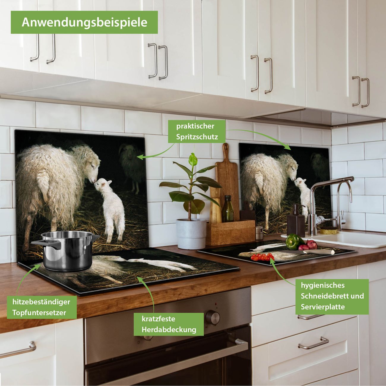 FUNKTION: Das banjado Schneidebrett mit Motiv Schaf Und Lamm ist groß und rutschfest und damit ideal für Ihre Küche. Besonders praktisch. Das Schneidebrett ist vielseitig einsetzbar: ob als Spritzschutz hinter dem Herd für Ihre Küche oder als Glas Schneidebrett als hygienische und geruchsneutrale Unterlage. Sie können ebenfalls heiße Töpfe und Pfannen bis 100°C auf der Herdplattenabdeckung abstellen. Sie erhalten ein Multitalent für Ihre Küche. QUALITÄT: Die Schneideplatte Glas besteht aus hochwertigem, gehärtetem und hitzebeständigem Glas. Wählen Sie aus einem unserer zahlreichen Motive das passende Design für Ihre Küche aus. DETAILS: Das Schneidebrett Glas groß ist in verschiedenen Größen verfügbar. Sie erhalten separate Gumminoppen damit Ihr großes Schneidebrett rutschfest in der Küche steht. VIELSEITIG: Das Schneidebrett modern ist ein Allrounder - als Schneideunterlage Küche direkt auf dem Herd oder separat und als Spritzschutz an der Wand aufgestellt - ein praktisches Küchenutensil. BANJADO: Auf Wunsch fertigen wir das Glas Schneide Brett auch als Sondergröße an. Mehrteilige Platten sind auch möglich. Kontaktieren Sie uns gern für eine Spezialanfertigung Ihrer Glasplatte Küche.