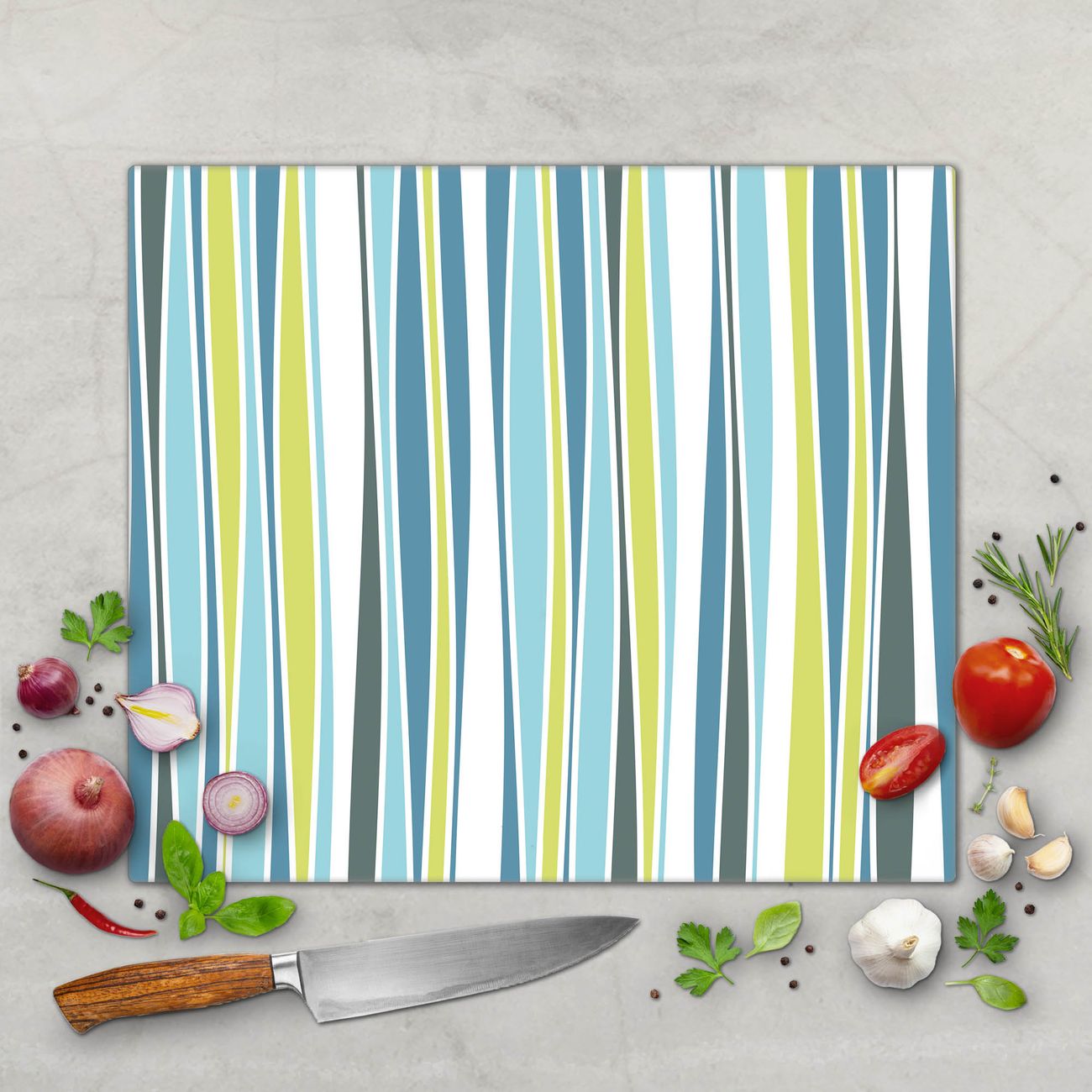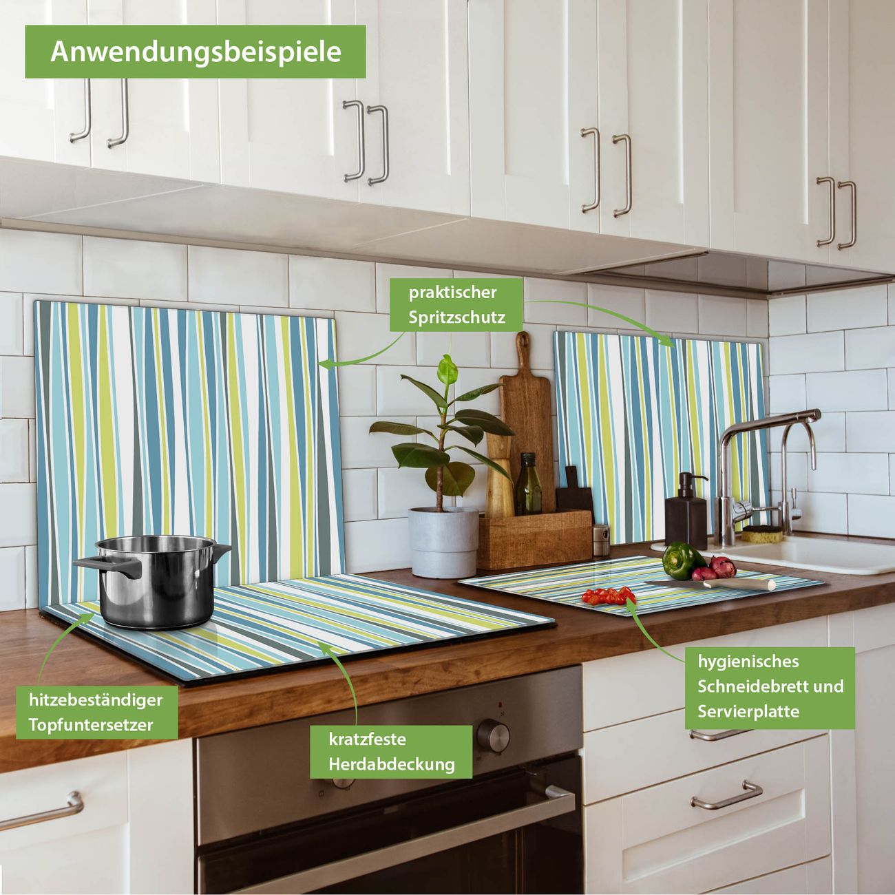 FUNKTION: Das banjado Schneidebrett mit Motiv Schilf Abstrakt ist groß und rutschfest und damit ideal für Ihre Küche. Besonders praktisch. Das Schneidebrett ist vielseitig einsetzbar: ob als Spritzschutz hinter dem Herd für Ihre Küche oder als Glas Schneidebrett als hygienische und geruchsneutrale Unterlage. Sie können ebenfalls heiße Töpfe und Pfannen bis 100°C auf der Herdplattenabdeckung abstellen. Sie erhalten ein Multitalent für Ihre Küche. QUALITÄT: Die Schneideplatte Glas besteht aus hochwertigem, gehärtetem und hitzebeständigem Glas. Wählen Sie aus einem unserer zahlreichen Motive das passende Design für Ihre Küche aus. DETAILS: Das Schneidebrett Glas groß ist in verschiedenen Größen verfügbar. Sie erhalten separate Gumminoppen damit Ihr großes Schneidebrett rutschfest in der Küche steht. VIELSEITIG: Das Schneidebrett modern ist ein Allrounder - als Schneideunterlage Küche direkt auf dem Herd oder separat und als Spritzschutz an der Wand aufgestellt - ein praktisches Küchenutensil. BANJADO: Auf Wunsch fertigen wir das Glas Schneide Brett auch als Sondergröße an. Mehrteilige Platten sind auch möglich. Kontaktieren Sie uns gern für eine Spezialanfertigung Ihrer Glasplatte Küche.