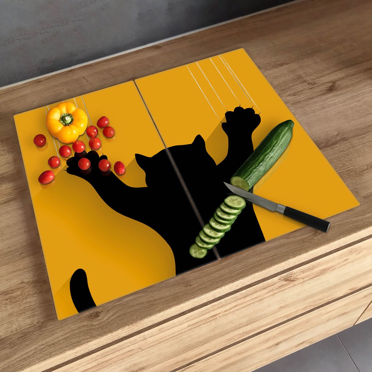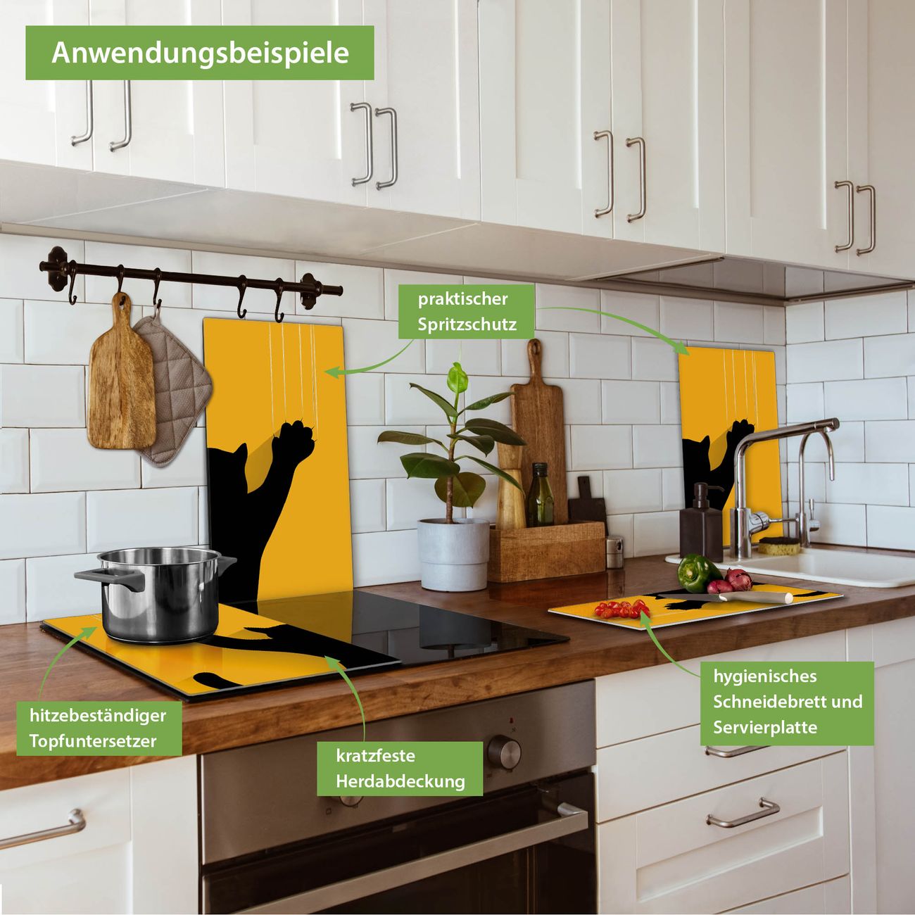FUNKTION: Das banjado Schneidebrett mit Motiv Scratch ist groß und rutschfest und damit ideal für Ihre Küche. Besonders praktisch. Das Schneidebrett ist vielseitig einsetzbar: ob als Spritzschutz hinter dem Herd für Ihre Küche oder als Glas Schneidebrett als hygienische und geruchsneutrale Unterlage. Sie können ebenfalls heiße Töpfe und Pfannen bis 100°C auf der Herdplattenabdeckung abstellen. Sie erhalten ein Multitalent für Ihre Küche. QUALITÄT: Die Schneideplatte Glas besteht aus hochwertigem, gehärtetem und hitzebeständigem Glas. Wählen Sie aus einem unserer zahlreichen Motive das passende Design für Ihre Küche aus. DETAILS: Das Schneidebrett Glas groß ist in verschiedenen Größen verfügbar. Sie erhalten separate Gumminoppen damit Ihr großes Schneidebrett rutschfest in der Küche steht. VIELSEITIG: Das Schneidebrett modern ist ein Allrounder - als Schneideunterlage Küche direkt auf dem Herd oder separat und als Spritzschutz an der Wand aufgestellt - ein praktisches Küchenutensil. BANJADO: Auf Wunsch fertigen wir das Glas Schneide Brett auch als Sondergröße an. Mehrteilige Platten sind auch möglich. Kontaktieren Sie uns gern für eine Spezialanfertigung Ihrer Glasplatte Küche.