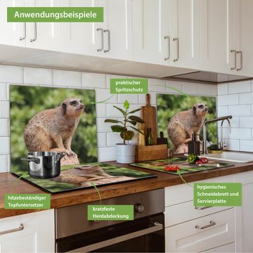 FUNKTION: Das banjado Schneidebrett mit Motiv Sitzendes Erdmännchen ist groß und rutschfest und damit ideal für Ihre Küche. Besonders praktisch. Das Schneidebrett ist vielseitig einsetzbar: ob als Spritzschutz hinter dem Herd für Ihre Küche oder als Glas Schneidebrett als hygienische und geruchsneutrale Unterlage. Sie können ebenfalls heiße Töpfe und Pfannen bis 100°C auf der Herdplattenabdeckung abstellen. Sie erhalten ein Multitalent für Ihre Küche. QUALITÄT: Die Schneideplatte Glas besteht aus hochwertigem, gehärtetem und hitzebeständigem Glas. Wählen Sie aus einem unserer zahlreichen Motive das passende Design für Ihre Küche aus. DETAILS: Das Schneidebrett Glas groß ist in verschiedenen Größen verfügbar. Sie erhalten separate Gumminoppen damit Ihr großes Schneidebrett rutschfest in der Küche steht. VIELSEITIG: Das Schneidebrett modern ist ein Allrounder - als Schneideunterlage Küche direkt auf dem Herd oder separat und als Spritzschutz an der Wand aufgestellt - ein praktisches Küchenutensil. BANJADO: Auf Wunsch fertigen wir das Glas Schneide Brett auch als Sondergröße an. Mehrteilige Platten sind auch möglich. Kontaktieren Sie uns gern für eine Spezialanfertigung Ihrer Glasplatte Küche.
