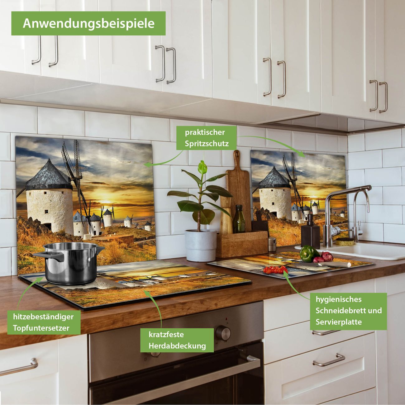 FUNKTION: Das banjado Schneidebrett mit Motiv Spanische Windmühlen ist groß und rutschfest und damit ideal für Ihre Küche. Besonders praktisch. Das Schneidebrett ist vielseitig einsetzbar: ob als Spritzschutz hinter dem Herd für Ihre Küche oder als Glas Schneidebrett als hygienische und geruchsneutrale Unterlage. Sie können ebenfalls heiße Töpfe und Pfannen bis 100°C auf der Herdplattenabdeckung abstellen. Sie erhalten ein Multitalent für Ihre Küche. QUALITÄT: Die Schneideplatte Glas besteht aus hochwertigem, gehärtetem und hitzebeständigem Glas. Wählen Sie aus einem unserer zahlreichen Motive das passende Design für Ihre Küche aus. DETAILS: Das Schneidebrett Glas groß ist in verschiedenen Größen verfügbar. Sie erhalten separate Gumminoppen damit Ihr großes Schneidebrett rutschfest in der Küche steht. VIELSEITIG: Das Schneidebrett modern ist ein Allrounder - als Schneideunterlage Küche direkt auf dem Herd oder separat und als Spritzschutz an der Wand aufgestellt - ein praktisches Küchenutensil. BANJADO: Auf Wunsch fertigen wir das Glas Schneide Brett auch als Sondergröße an. Mehrteilige Platten sind auch möglich. Kontaktieren Sie uns gern für eine Spezialanfertigung Ihrer Glasplatte Küche.