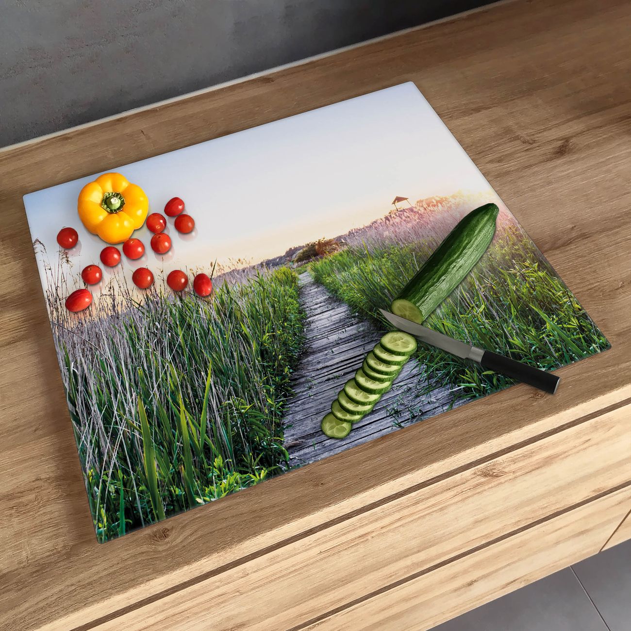 FUNKTION: Das banjado Schneidebrett mit Motiv Steg Durchs Schilf ist groß und rutschfest und damit ideal für Ihre Küche. Besonders praktisch. Das Schneidebrett ist vielseitig einsetzbar: ob als Spritzschutz hinter dem Herd für Ihre Küche oder als Glas Schneidebrett als hygienische und geruchsneutrale Unterlage. Sie können ebenfalls heiße Töpfe und Pfannen bis 100°C auf der Herdplattenabdeckung abstellen. Sie erhalten ein Multitalent für Ihre Küche. QUALITÄT: Die Schneideplatte Glas besteht aus hochwertigem, gehärtetem und hitzebeständigem Glas. Wählen Sie aus einem unserer zahlreichen Motive das passende Design für Ihre Küche aus. DETAILS: Das Schneidebrett Glas groß ist in verschiedenen Größen verfügbar. Sie erhalten separate Gumminoppen damit Ihr großes Schneidebrett rutschfest in der Küche steht. VIELSEITIG: Das Schneidebrett modern ist ein Allrounder - als Schneideunterlage Küche direkt auf dem Herd oder separat und als Spritzschutz an der Wand aufgestellt - ein praktisches Küchenutensil. BANJADO: Auf Wunsch fertigen wir das Glas Schneide Brett auch als Sondergröße an. Mehrteilige Platten sind auch möglich. Kontaktieren Sie uns gern für eine Spezialanfertigung Ihrer Glasplatte Küche.