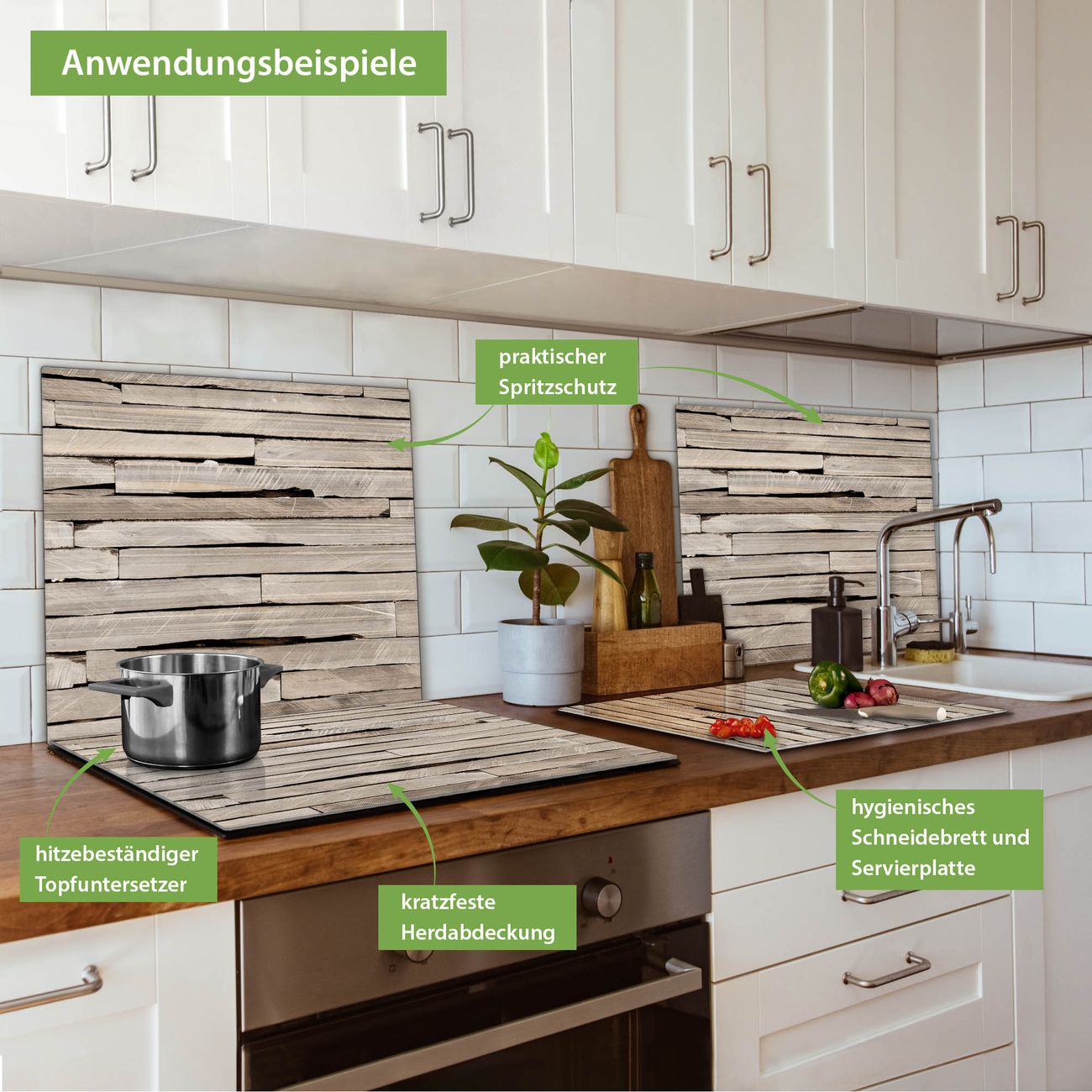 FUNKTION: Das banjado Schneidebrett mit Motiv Steinplatten ist groß und rutschfest und damit ideal für Ihre Küche. Besonders praktisch. Das Schneidebrett ist vielseitig einsetzbar: ob als Spritzschutz hinter dem Herd für Ihre Küche oder als Glas Schneidebrett als hygienische und geruchsneutrale Unterlage. Sie können ebenfalls heiße Töpfe und Pfannen bis 100°C auf der Herdplattenabdeckung abstellen. Sie erhalten ein Multitalent für Ihre Küche. QUALITÄT: Die Schneideplatte Glas besteht aus hochwertigem, gehärtetem und hitzebeständigem Glas. Wählen Sie aus einem unserer zahlreichen Motive das passende Design für Ihre Küche aus. DETAILS: Das Schneidebrett Glas groß ist in verschiedenen Größen verfügbar. Sie erhalten separate Gumminoppen damit Ihr großes Schneidebrett rutschfest in der Küche steht. VIELSEITIG: Das Schneidebrett modern ist ein Allrounder - als Schneideunterlage Küche direkt auf dem Herd oder separat und als Spritzschutz an der Wand aufgestellt - ein praktisches Küchenutensil. BANJADO: Auf Wunsch fertigen wir das Glas Schneide Brett auch als Sondergröße an. Mehrteilige Platten sind auch möglich. Kontaktieren Sie uns gern für eine Spezialanfertigung Ihrer Glasplatte Küche.