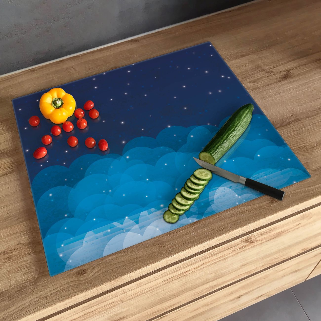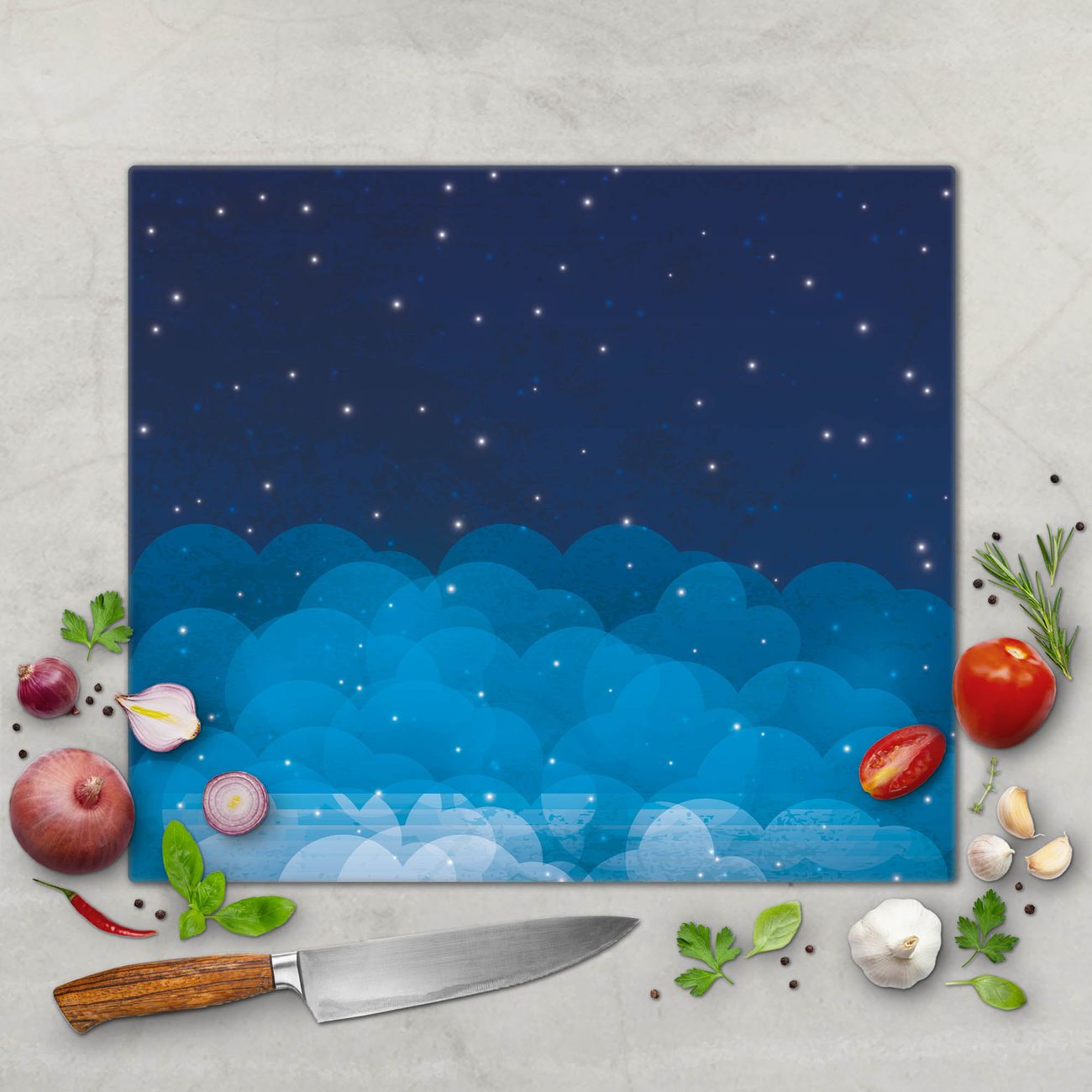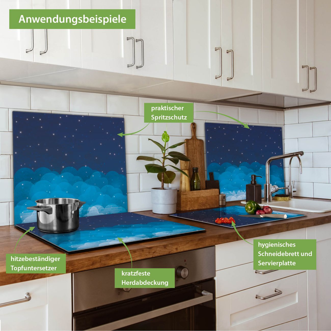 FUNKTION: Das banjado Schneidebrett mit Motiv Sternenhimmel 2 ist groß und rutschfest und damit ideal für Ihre Küche. Besonders praktisch. Das Schneidebrett ist vielseitig einsetzbar: ob als Spritzschutz hinter dem Herd für Ihre Küche oder als Glas Schneidebrett als hygienische und geruchsneutrale Unterlage. Sie können ebenfalls heiße Töpfe und Pfannen bis 100°C auf der Herdplattenabdeckung abstellen. Sie erhalten ein Multitalent für Ihre Küche. QUALITÄT: Die Schneideplatte Glas besteht aus hochwertigem, gehärtetem und hitzebeständigem Glas. Wählen Sie aus einem unserer zahlreichen Motive das passende Design für Ihre Küche aus. DETAILS: Das Schneidebrett Glas groß ist in verschiedenen Größen verfügbar. Sie erhalten separate Gumminoppen damit Ihr großes Schneidebrett rutschfest in der Küche steht. VIELSEITIG: Das Schneidebrett modern ist ein Allrounder - als Schneideunterlage Küche direkt auf dem Herd oder separat und als Spritzschutz an der Wand aufgestellt - ein praktisches Küchenutensil. BANJADO: Auf Wunsch fertigen wir das Glas Schneide Brett auch als Sondergröße an. Mehrteilige Platten sind auch möglich. Kontaktieren Sie uns gern für eine Spezialanfertigung Ihrer Glasplatte Küche.