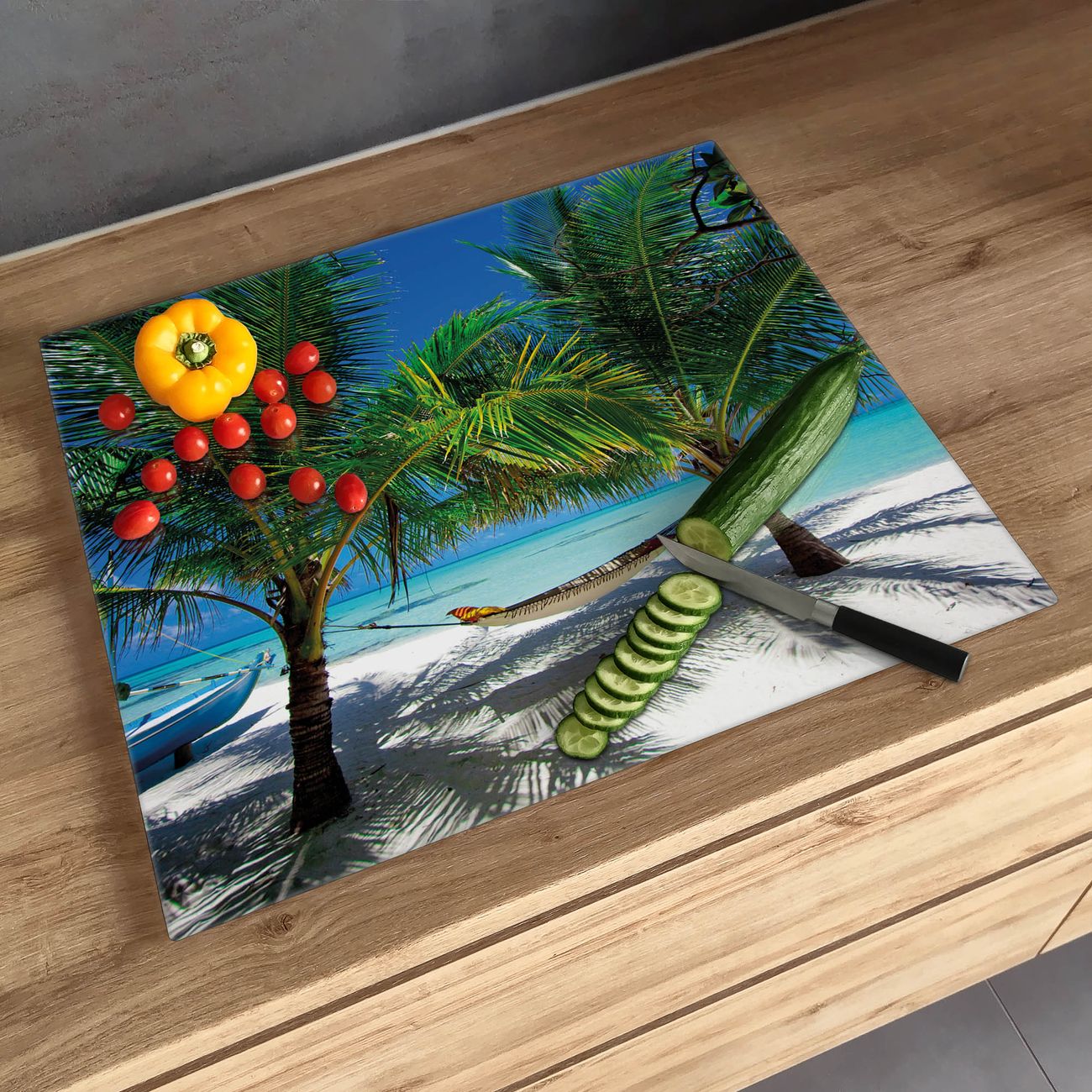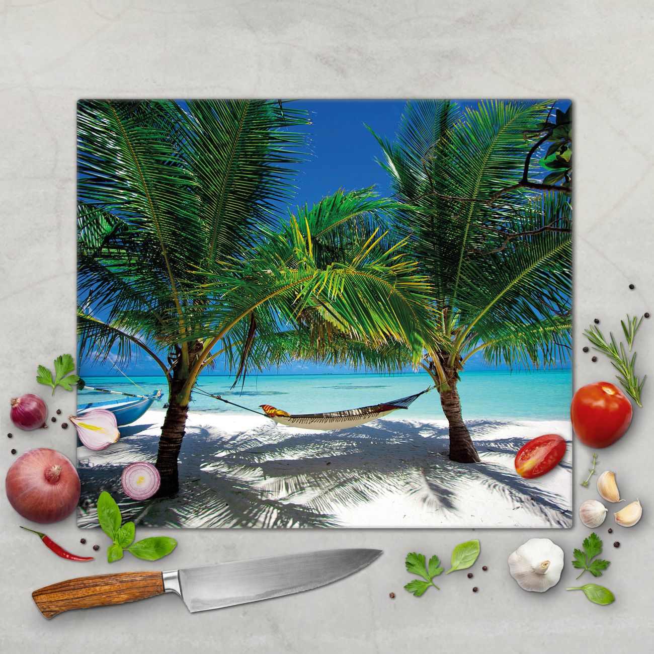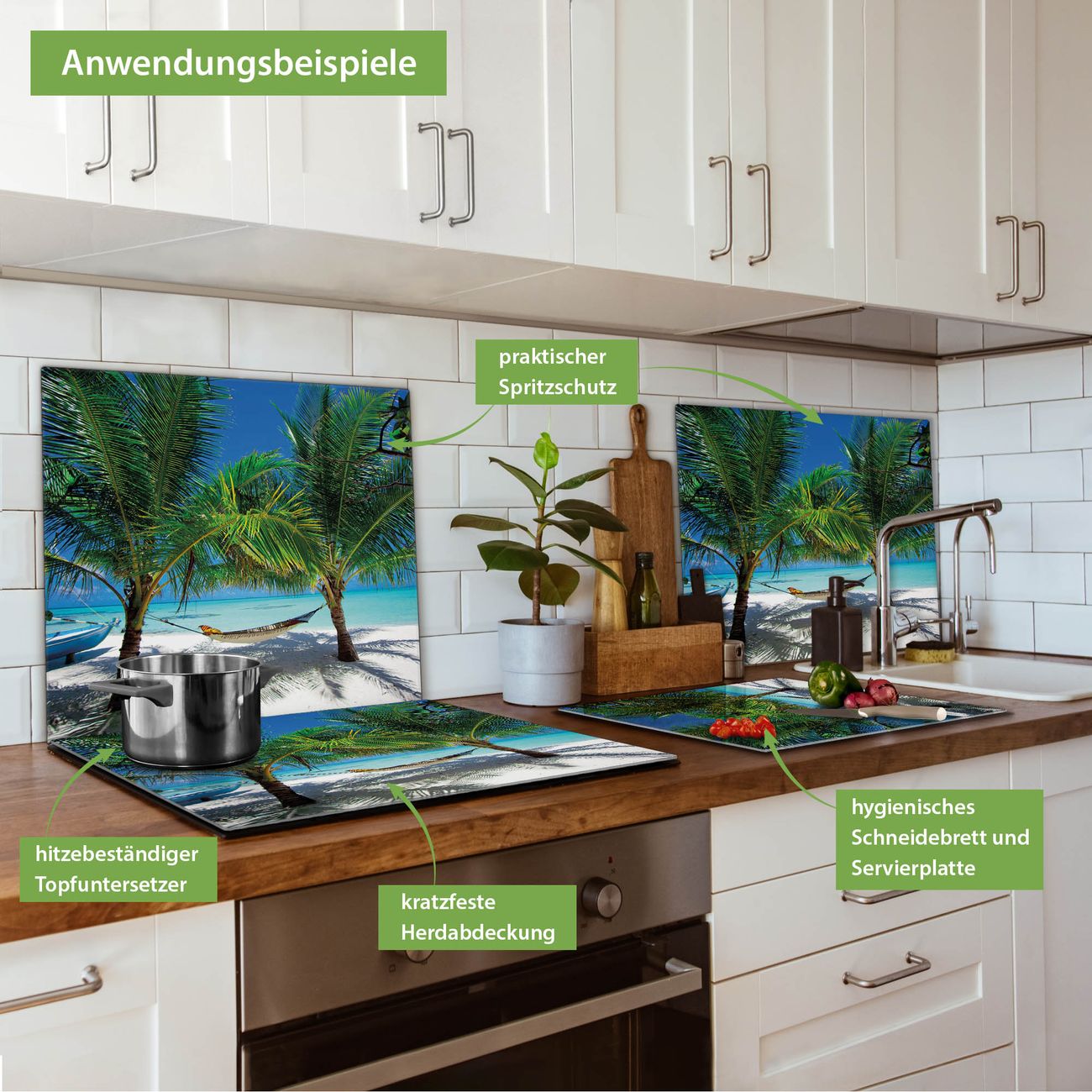 FUNKTION: Das banjado Schneidebrett mit Motiv Strand ist groß und rutschfest und damit ideal für Ihre Küche. Besonders praktisch. Das Schneidebrett ist vielseitig einsetzbar: ob als Spritzschutz hinter dem Herd für Ihre Küche oder als Glas Schneidebrett als hygienische und geruchsneutrale Unterlage. Sie können ebenfalls heiße Töpfe und Pfannen bis 100°C auf der Herdplattenabdeckung abstellen. Sie erhalten ein Multitalent für Ihre Küche. QUALITÄT: Die Schneideplatte Glas besteht aus hochwertigem, gehärtetem und hitzebeständigem Glas. Wählen Sie aus einem unserer zahlreichen Motive das passende Design für Ihre Küche aus. DETAILS: Das Schneidebrett Glas groß ist in verschiedenen Größen verfügbar. Sie erhalten separate Gumminoppen damit Ihr großes Schneidebrett rutschfest in der Küche steht. VIELSEITIG: Das Schneidebrett modern ist ein Allrounder - als Schneideunterlage Küche direkt auf dem Herd oder separat und als Spritzschutz an der Wand aufgestellt - ein praktisches Küchenutensil. BANJADO: Auf Wunsch fertigen wir das Glas Schneide Brett auch als Sondergröße an. Mehrteilige Platten sind auch möglich. Kontaktieren Sie uns gern für eine Spezialanfertigung Ihrer Glasplatte Küche.