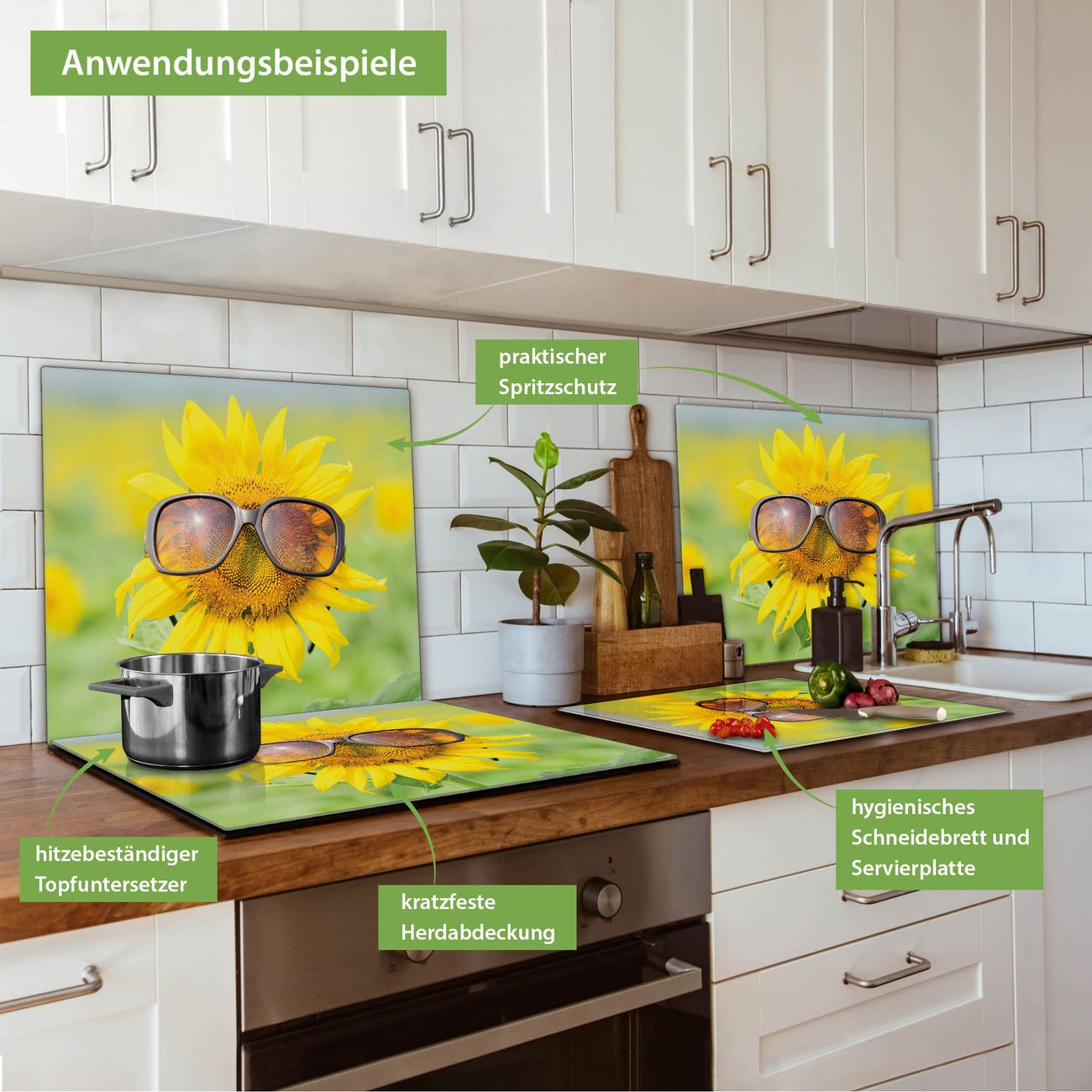 FUNKTION: Das banjado Schneidebrett mit Motiv Sunny ist groß und rutschfest und damit ideal für Ihre Küche. Besonders praktisch. Das Schneidebrett ist vielseitig einsetzbar: ob als Spritzschutz hinter dem Herd für Ihre Küche oder als Glas Schneidebrett als hygienische und geruchsneutrale Unterlage. Sie können ebenfalls heiße Töpfe und Pfannen bis 100°C auf der Herdplattenabdeckung abstellen. Sie erhalten ein Multitalent für Ihre Küche. QUALITÄT: Die Schneideplatte Glas besteht aus hochwertigem, gehärtetem und hitzebeständigem Glas. Wählen Sie aus einem unserer zahlreichen Motive das passende Design für Ihre Küche aus. DETAILS: Das Schneidebrett Glas groß ist in verschiedenen Größen verfügbar. Sie erhalten separate Gumminoppen damit Ihr großes Schneidebrett rutschfest in der Küche steht. VIELSEITIG: Das Schneidebrett modern ist ein Allrounder - als Schneideunterlage Küche direkt auf dem Herd oder separat und als Spritzschutz an der Wand aufgestellt - ein praktisches Küchenutensil. BANJADO: Auf Wunsch fertigen wir das Glas Schneide Brett auch als Sondergröße an. Mehrteilige Platten sind auch möglich. Kontaktieren Sie uns gern für eine Spezialanfertigung Ihrer Glasplatte Küche.